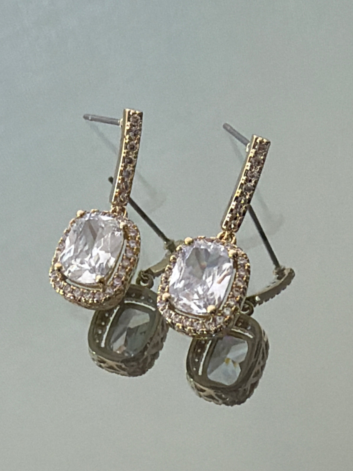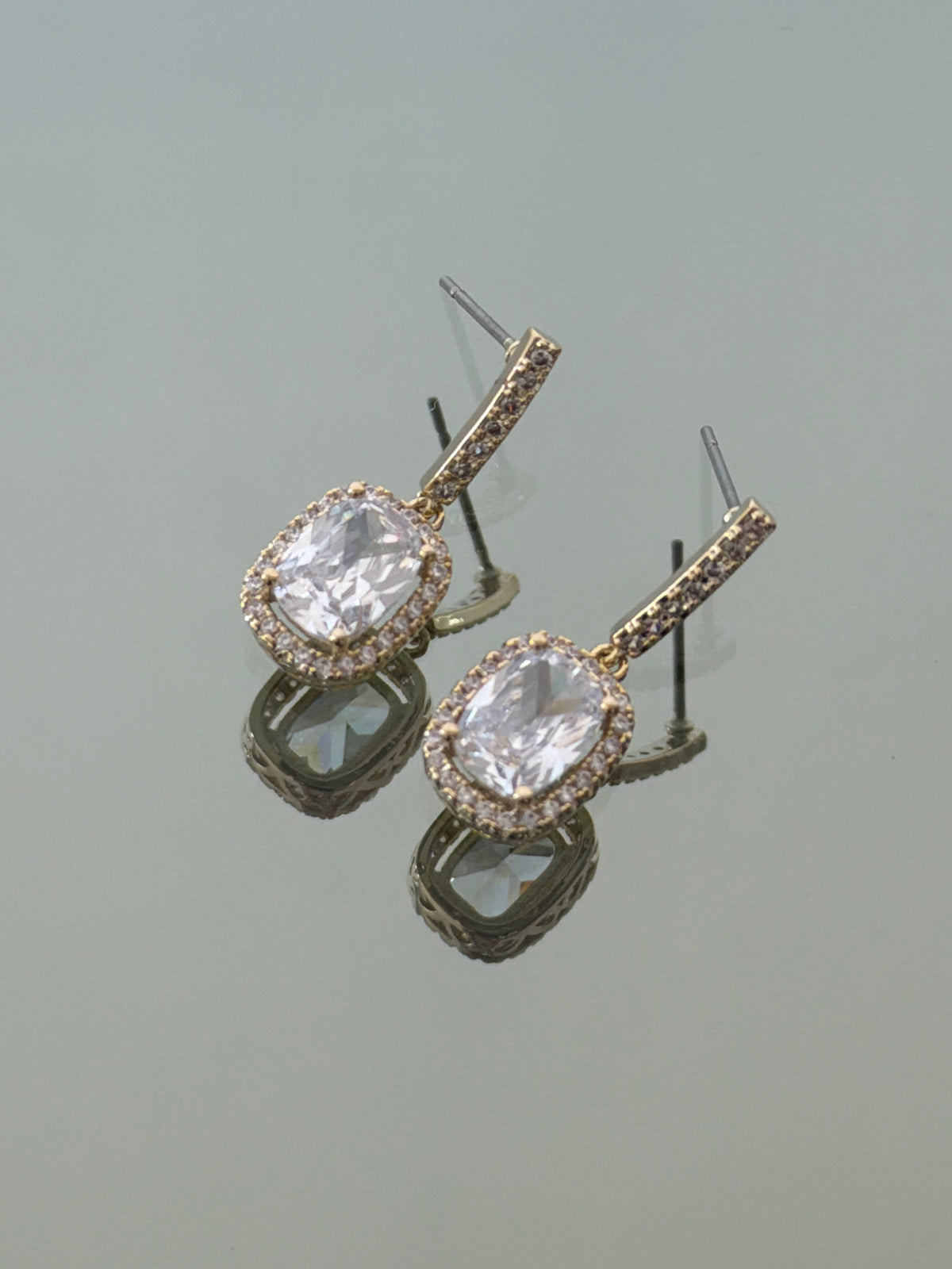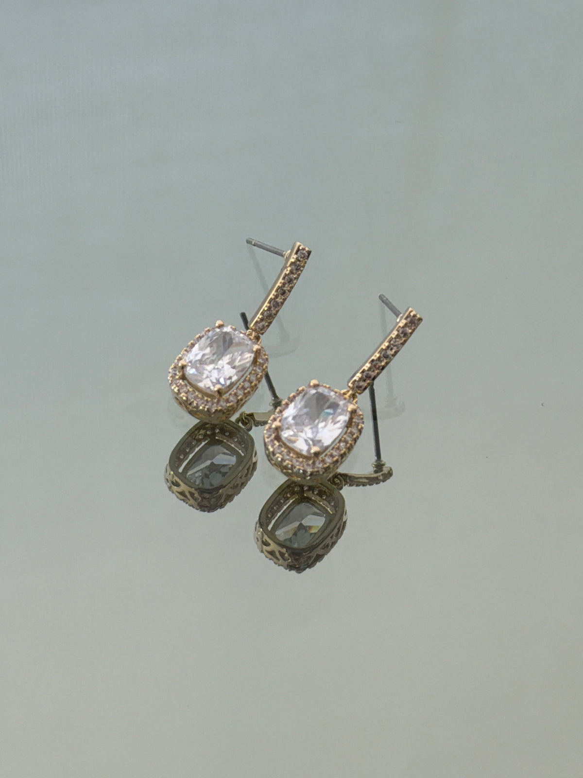 Pendiente largo dorado de 2,5 X 0,7 cm, totalmente con strass de gran brillo.