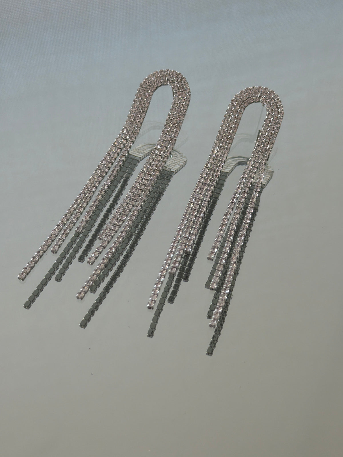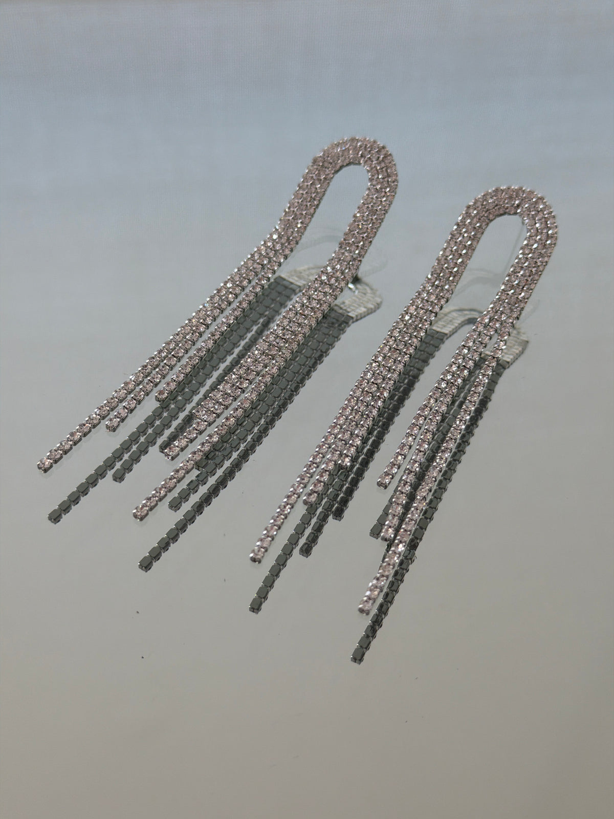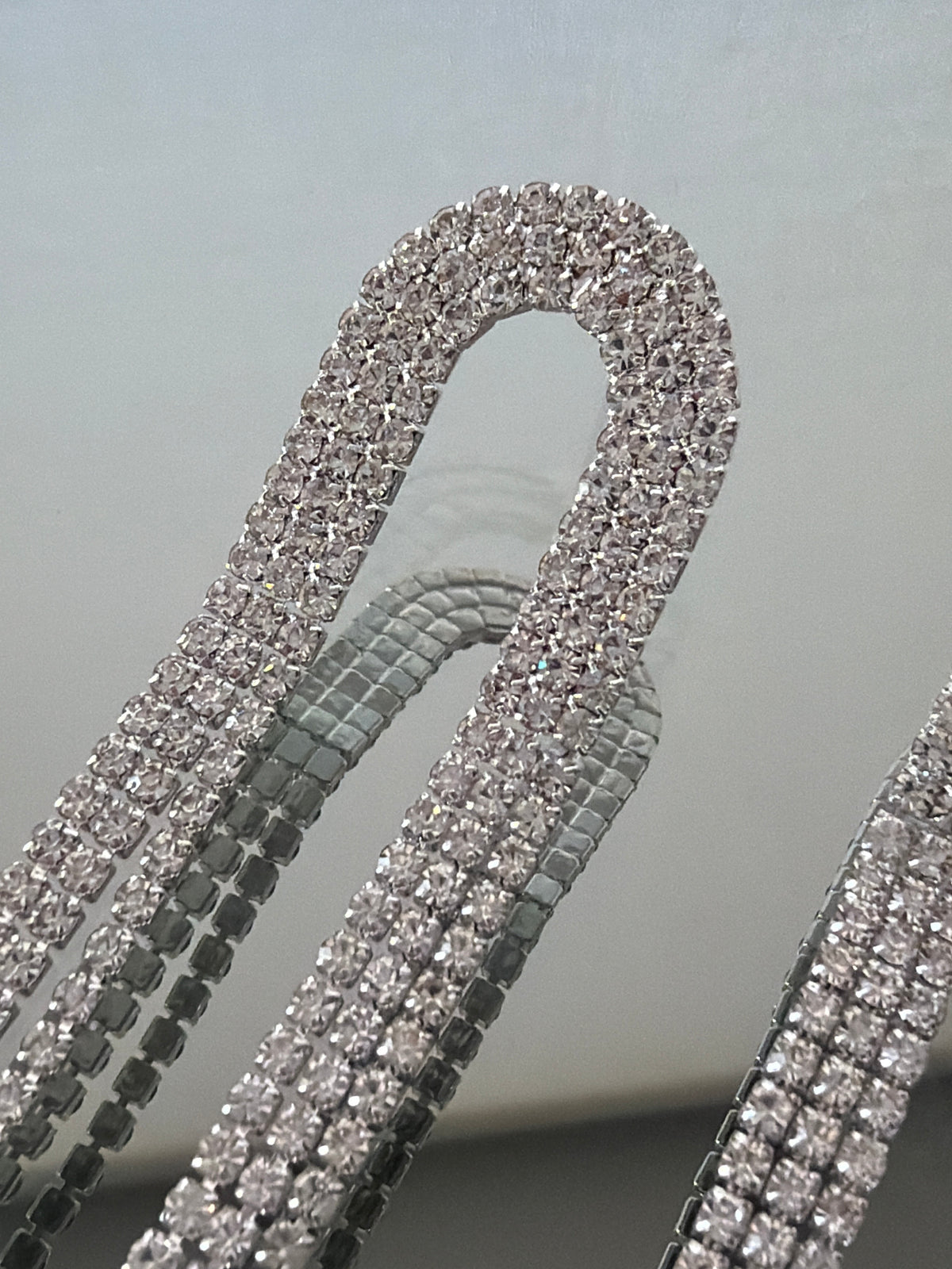 Pendiente largo dorado de 9,5 X 2 cm, totalmente con strass de gran brillo.