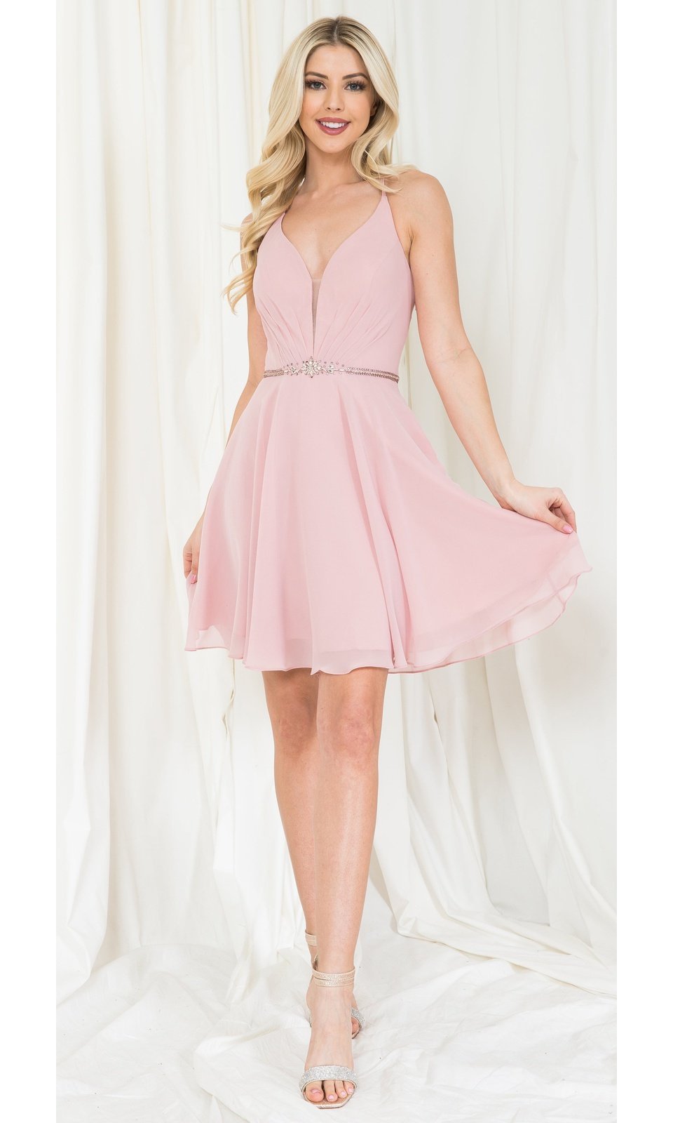 Adorable vestido corto de gasa con escote en V, espalda descubierta estilo corset, los tirantes finos se unen en un broche en el cuello para dar forma a una espalda en T antes de dar lugar a un sensual detalle de cordones. cintura adornada con piedras le da un toque glamoroso, cierre / cremallera lateral oculta.