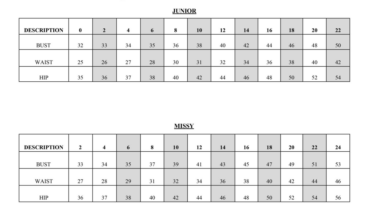 Tabla de medidas equivale a la junior y esta en pulgadas y la talla es por ejemplo xs es igual a talla 4 y asi sucesivamente.