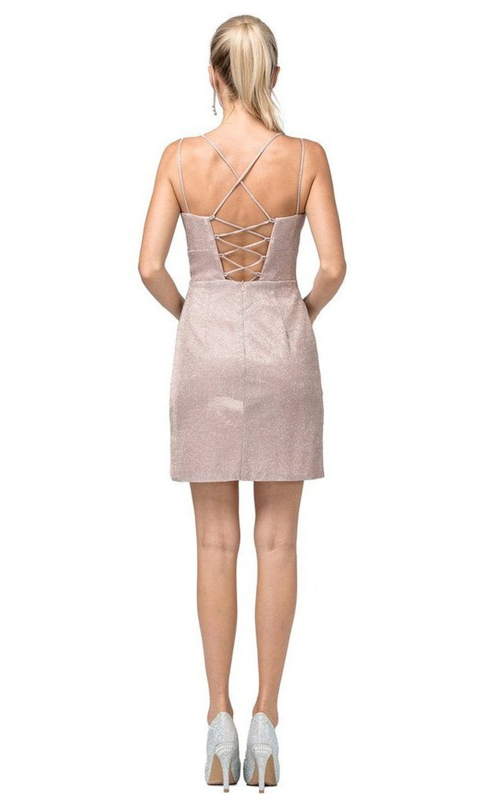 Vestido corto confeccionado en suave punto brillante, corpiño ajustado enmarcado con un escote corazón con dos tirantes finos que conducen a la espalda abierta con tiras entrecruzadas con cierre estilo corsé. Una banda ancha perfila la cintura imperio.