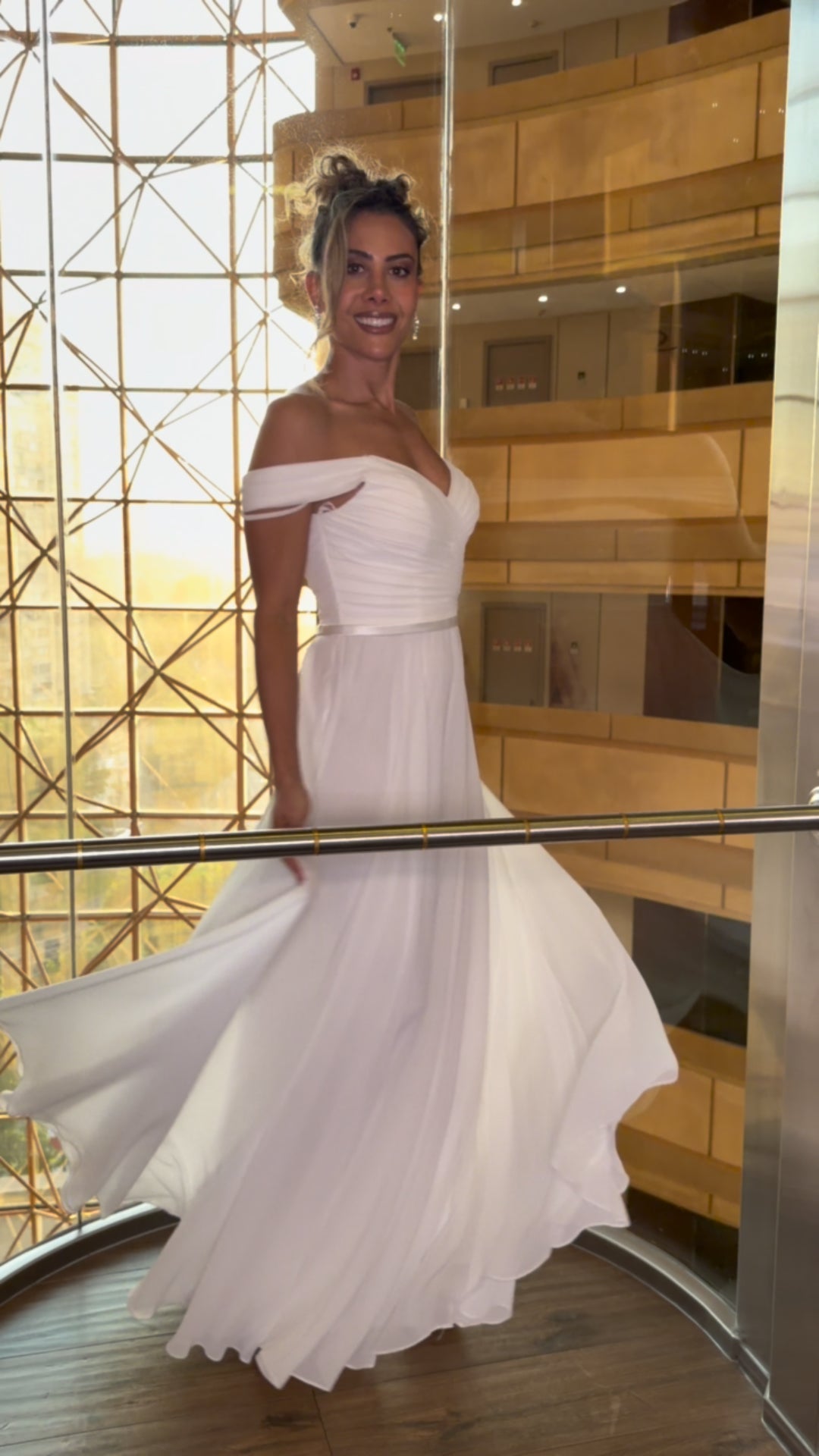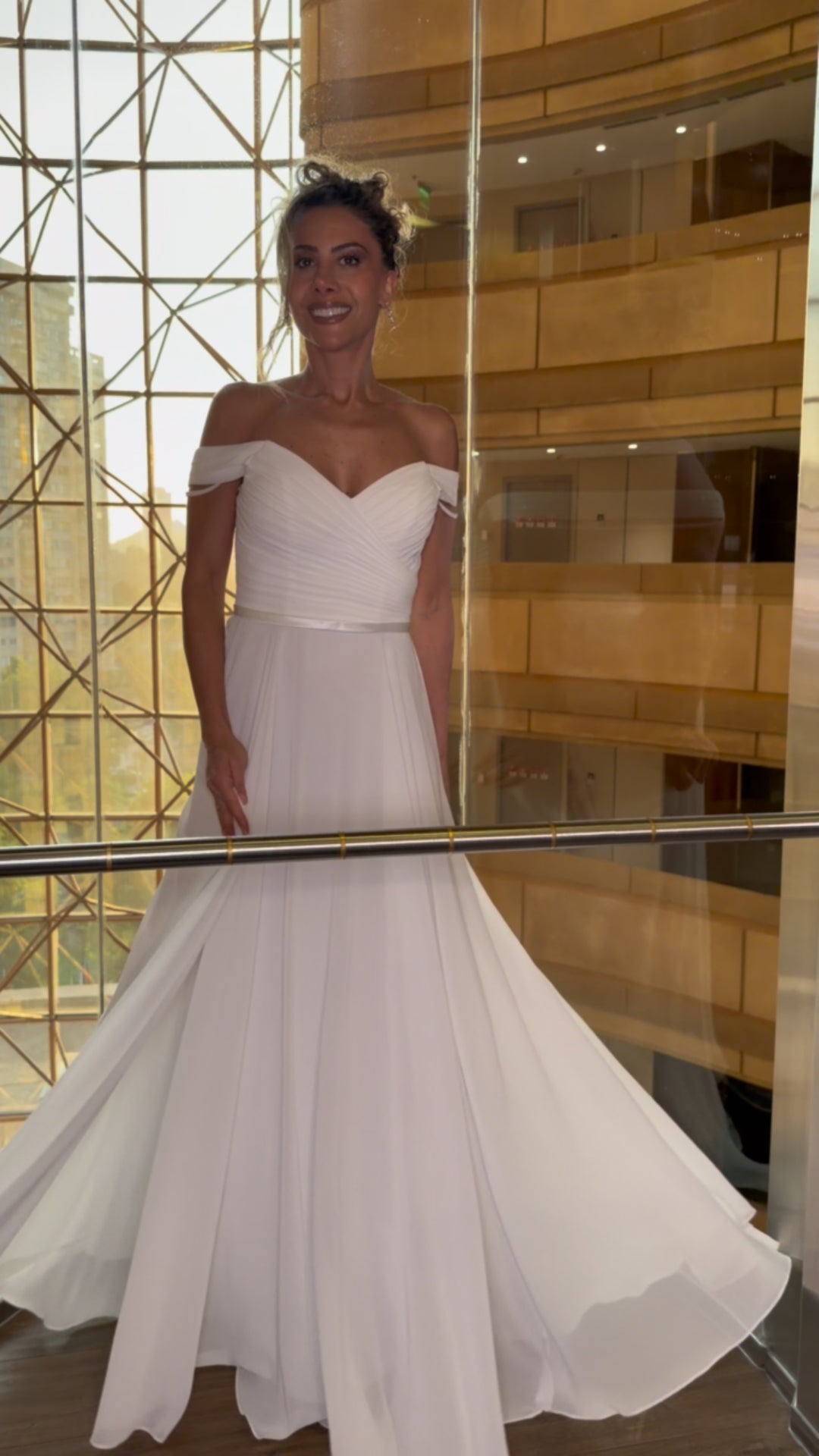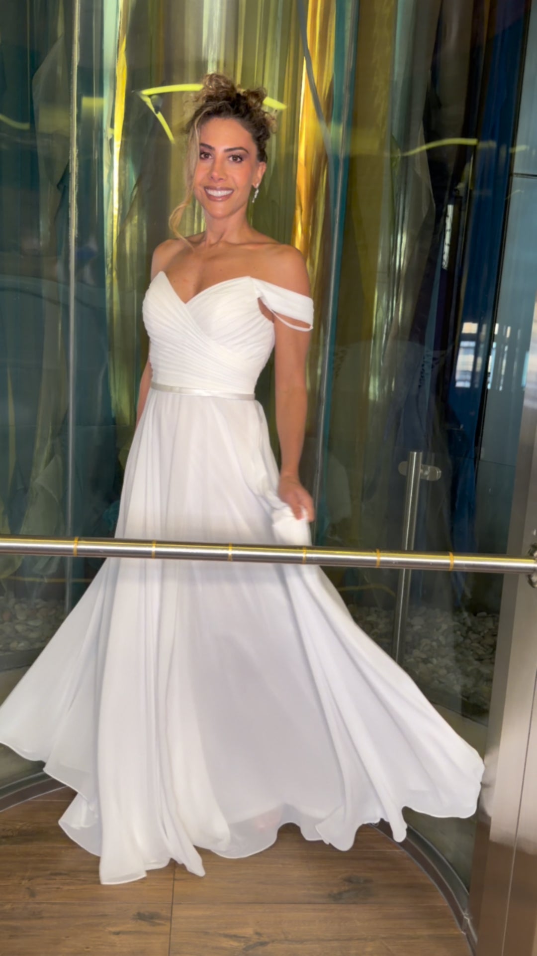 Vestido drapeado arriba, corte en cintura, hombros caidos, y caida suelta.