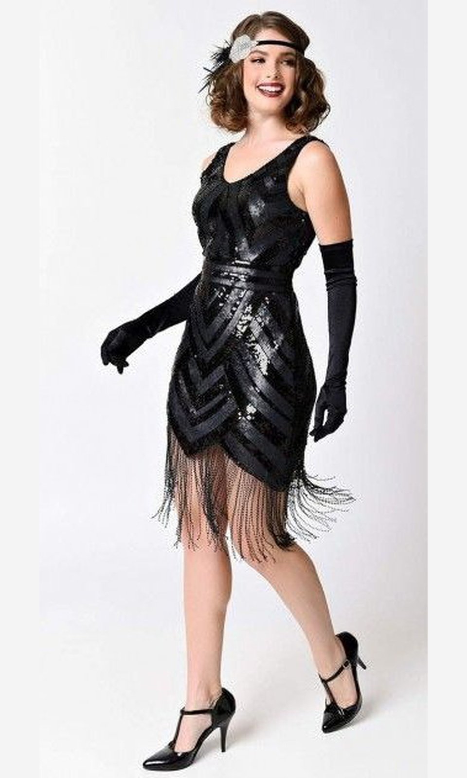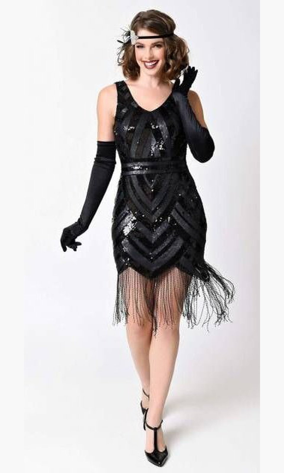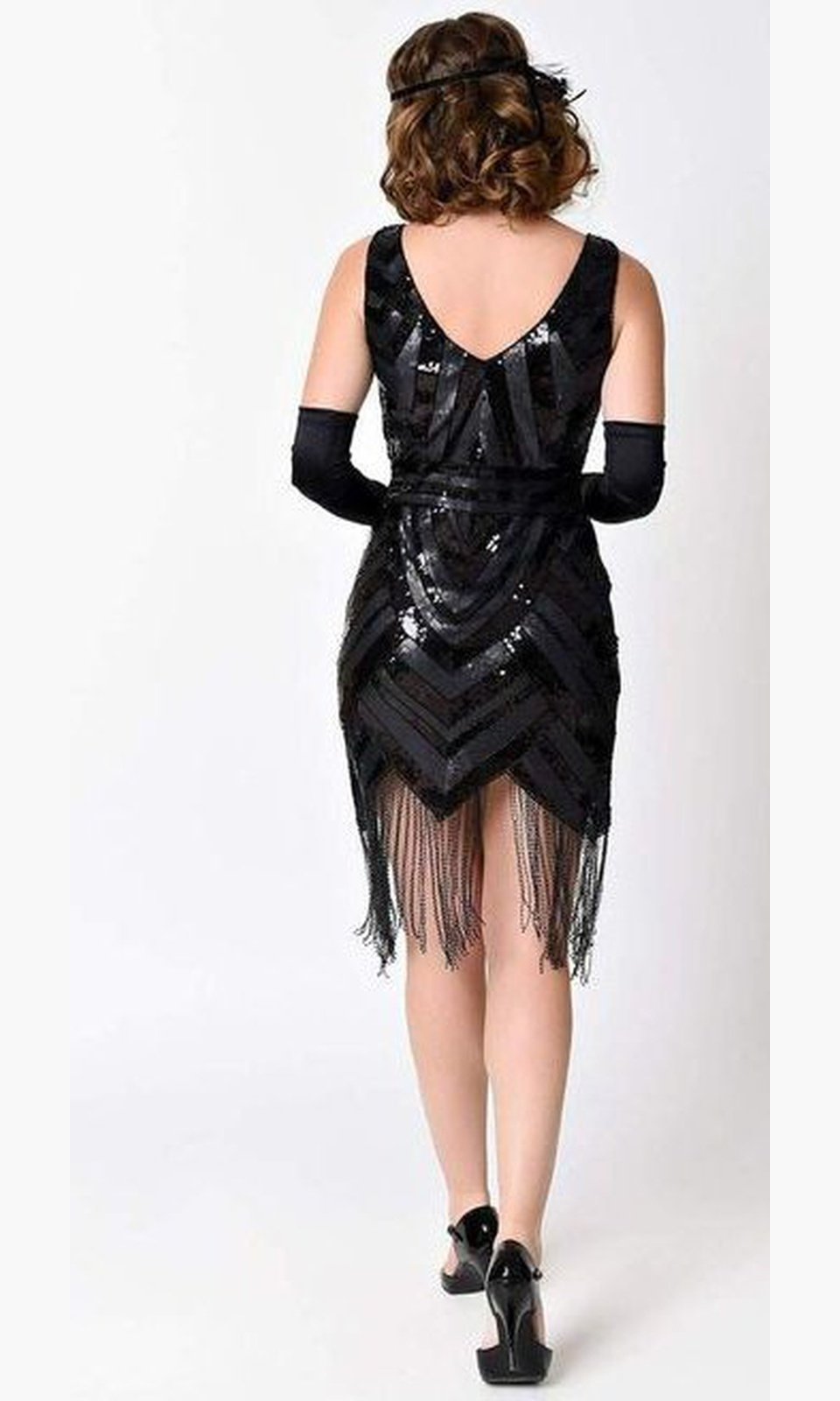 Vestido estilo flapper con malla negra suave y ajustada sobre el forro de punto negro, adornado con lentejuelas negras estampadas y brillos en todo. Un dobladillo puntiagudo gotea con flecos negros que bailan hasta tus rodillas mientras la silueta sin mangas y el sensual escote en V le dan una forma brillante.