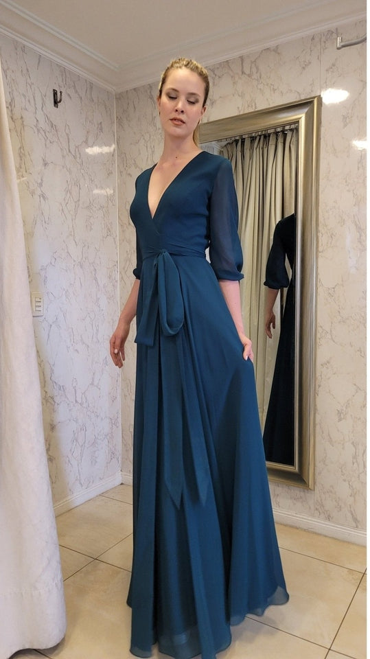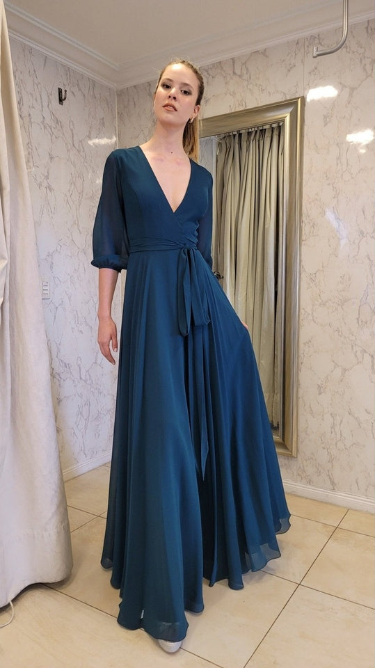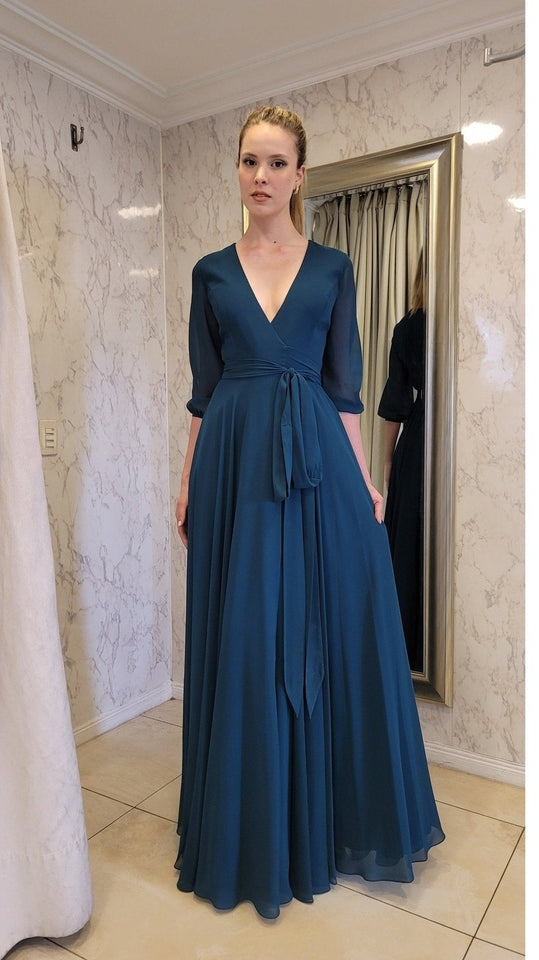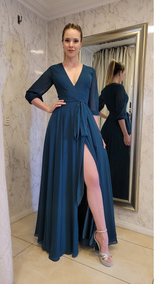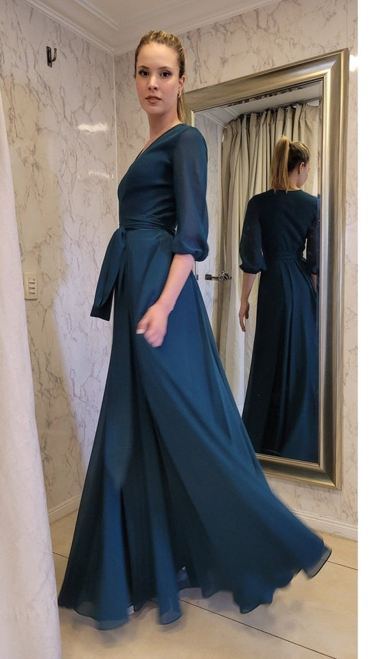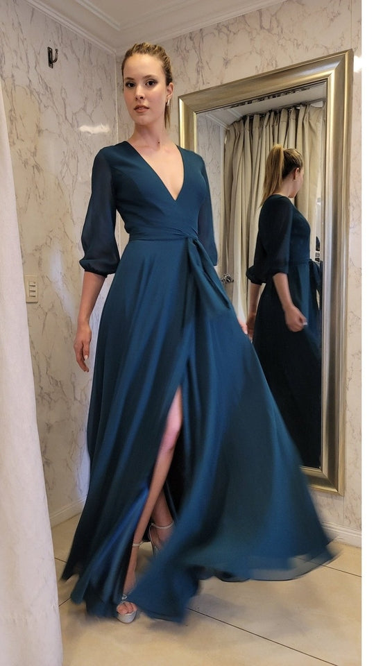 Vestido de gasa suelto con caída recta y mangas, ideal para un evento de tarde noche. Quedarás súper bien vestida y elegante!