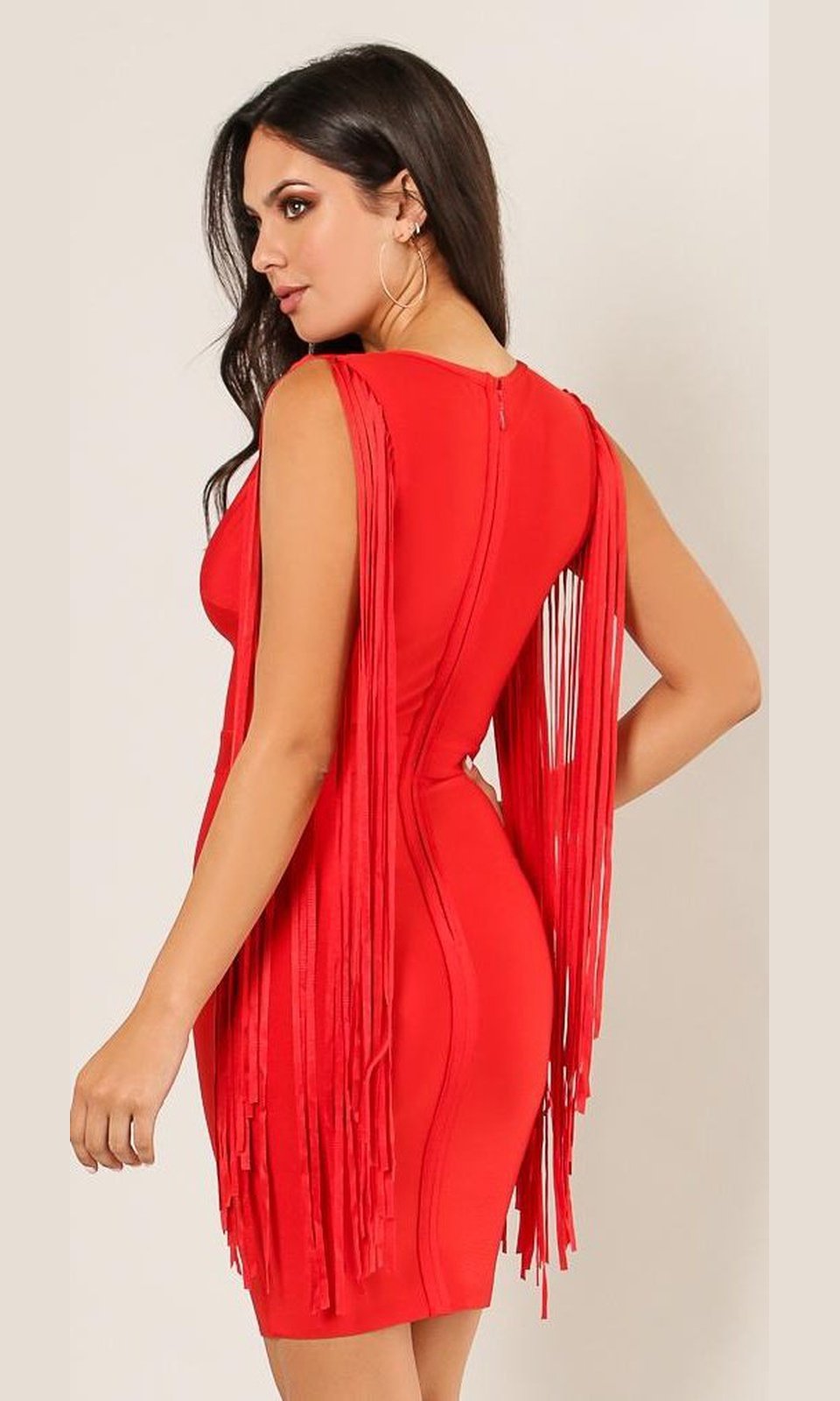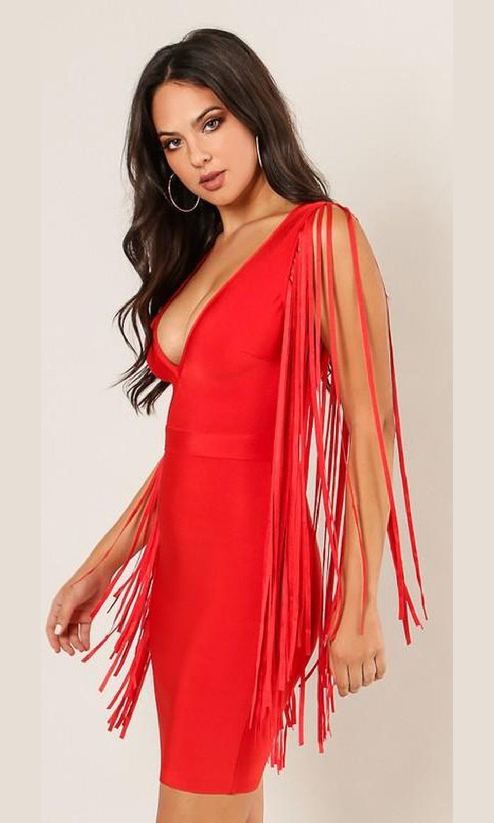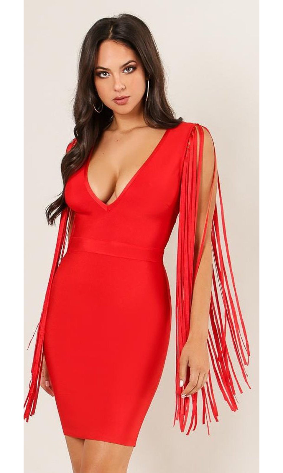 Vestido corto con manga de flecos y vendaje, presenta un escote en V pronunciado y es ajustado al cuerpo.