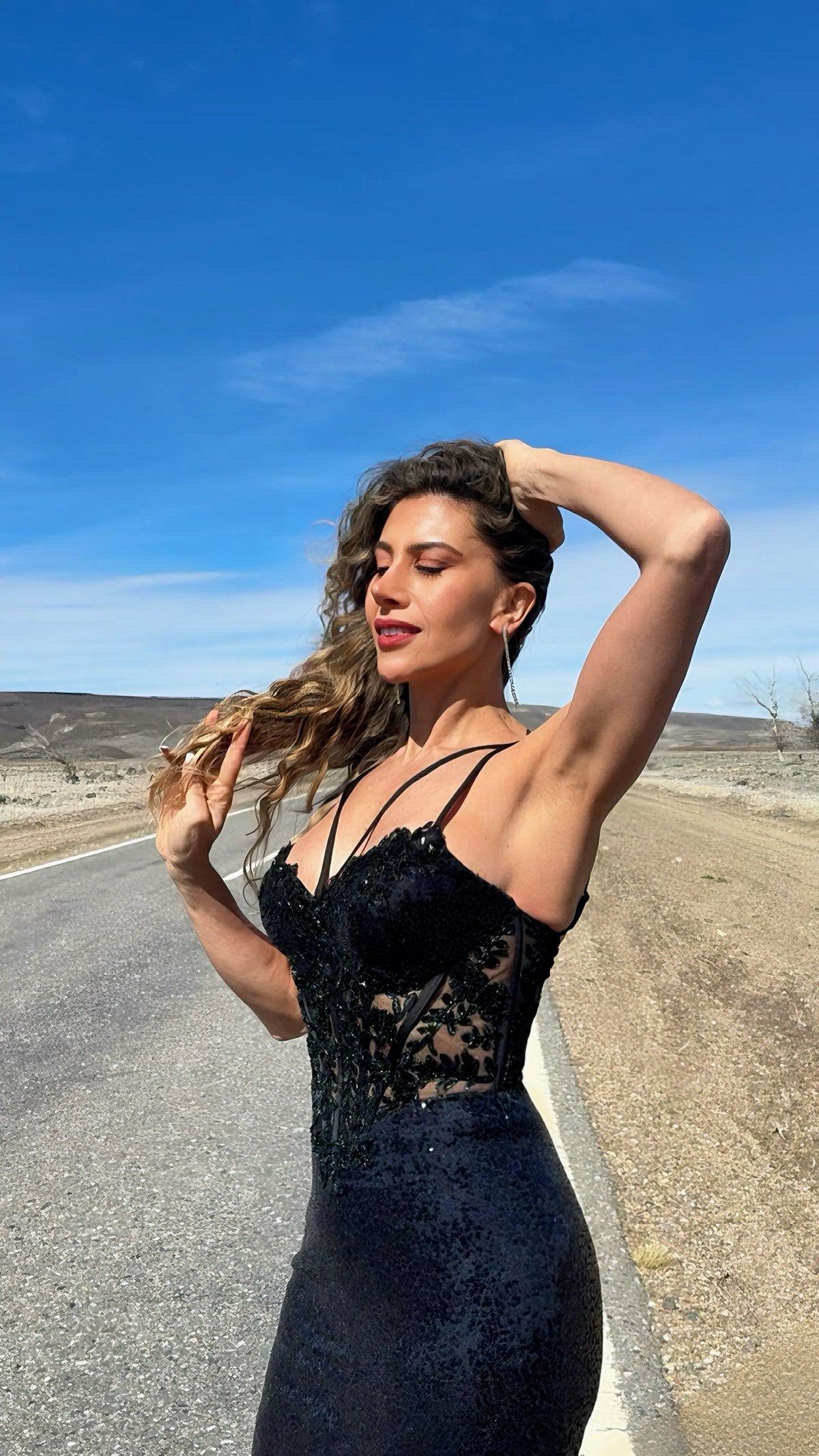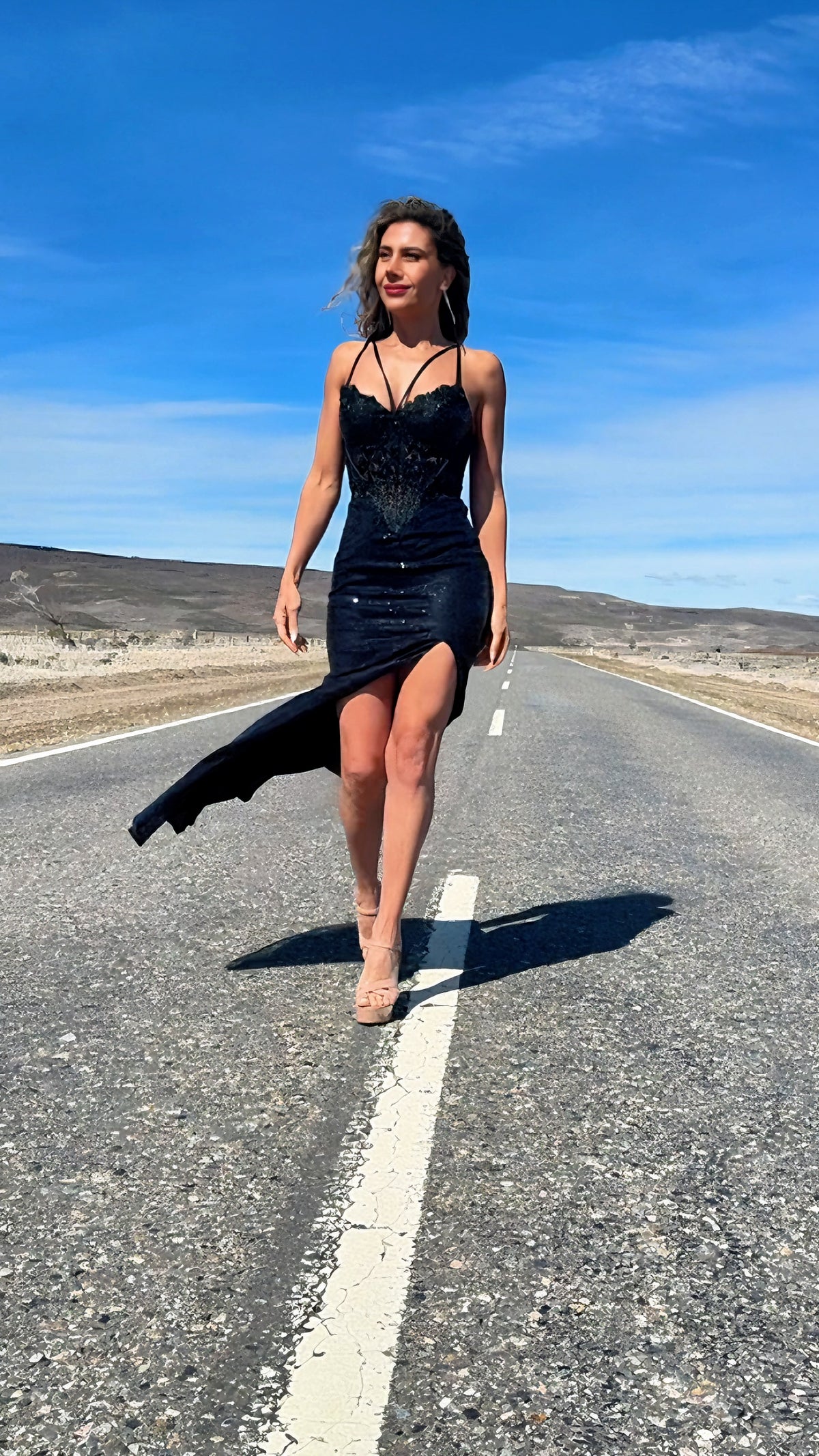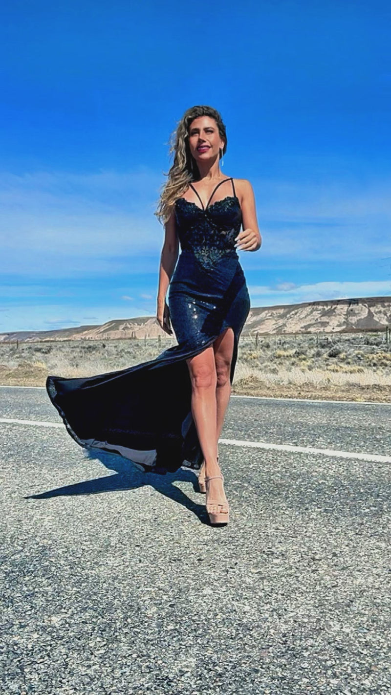 Este vestido largo de fiesta es puro magnetismo y sofisticación. Con un corset estructurado adornado con encaje y pedrería delicada, realza la silueta de forma impecable. La falda de lentejuelas cae con brillo sutil y un toque de sensualidad gracias a su abertura lateral, permitiendo un movimiento fluido y lleno de glamour. Los finos tirantes dobles añaden un detalle moderno y femenino.