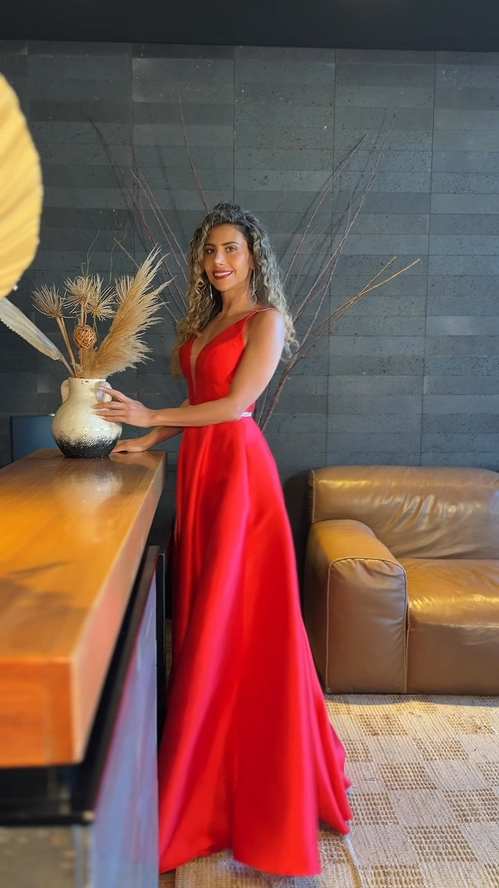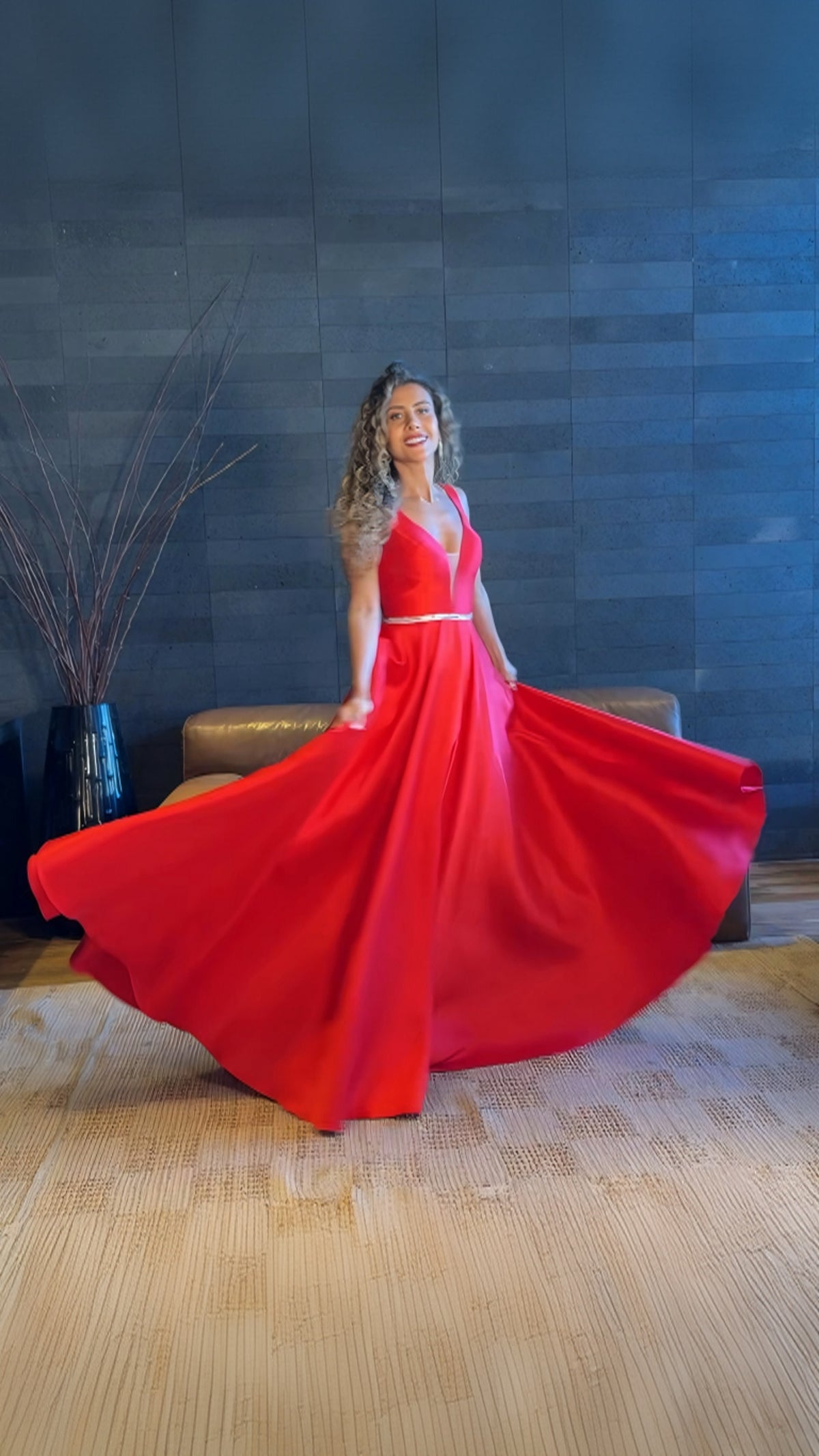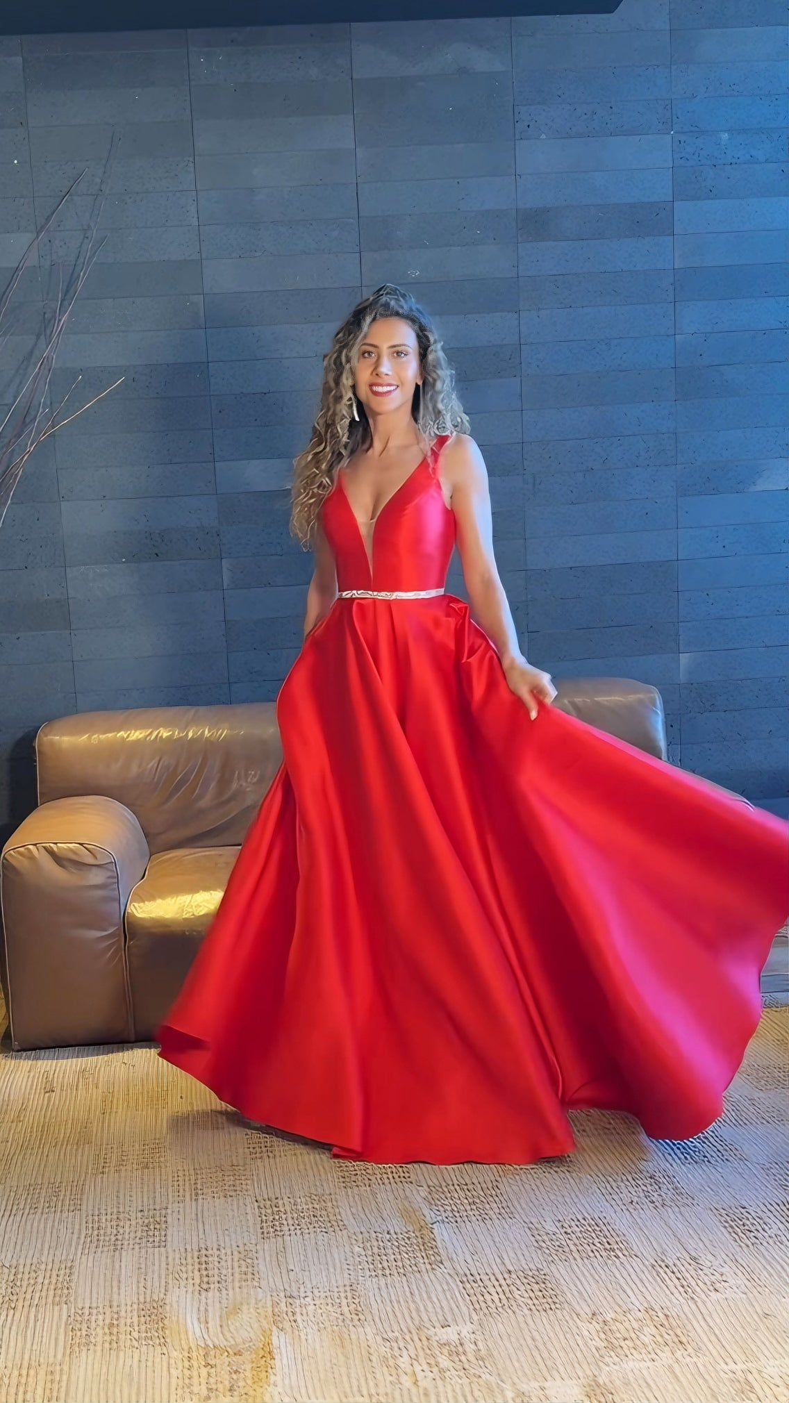 Este vestido largo destaca por su gran faldón imponente que aporta elegancia y presencia. Su escote en V realza la figura, mientras que los bolcillos añaden un toque práctico y sofisticado. El cinturón delicado con strass complementa el diseño, aportando un brillo sutil que resalta el corte en A, favoreciendo una silueta estilizada y femenina. Ideal para ocasiones especiales donde se busca un look distinguido y refinado.
