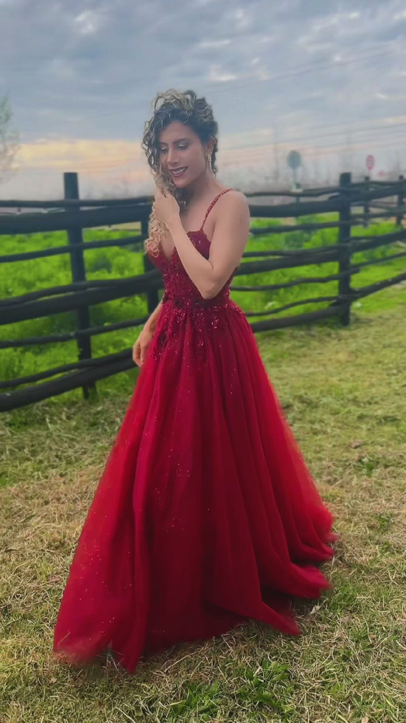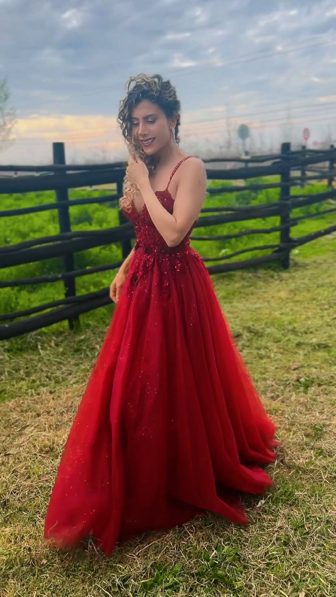 Este vestido largo en rojo destaca por su escote en triángulo en V, adornado con delicadas flores y encajes en la parte superior, que aportan un toque elegante y femenino. Su faldón amplio con corte en A incluye sutiles minibrilitos, ofreciendo un brillo discreto que realza la sofisticación del diseño. Ideal para ocasiones especiales donde se busca un equilibrio entre estilo clásico y detalles modernos.