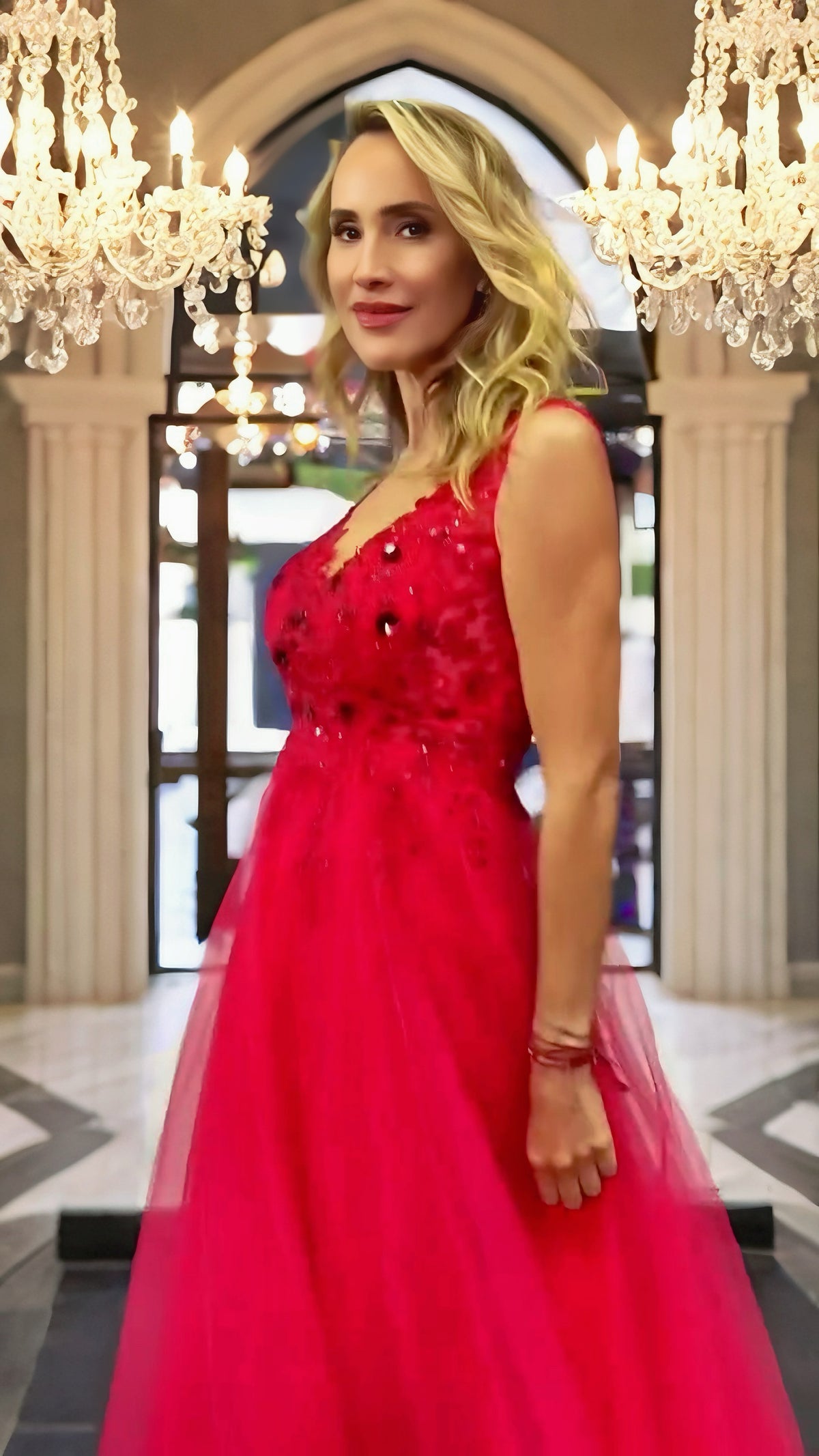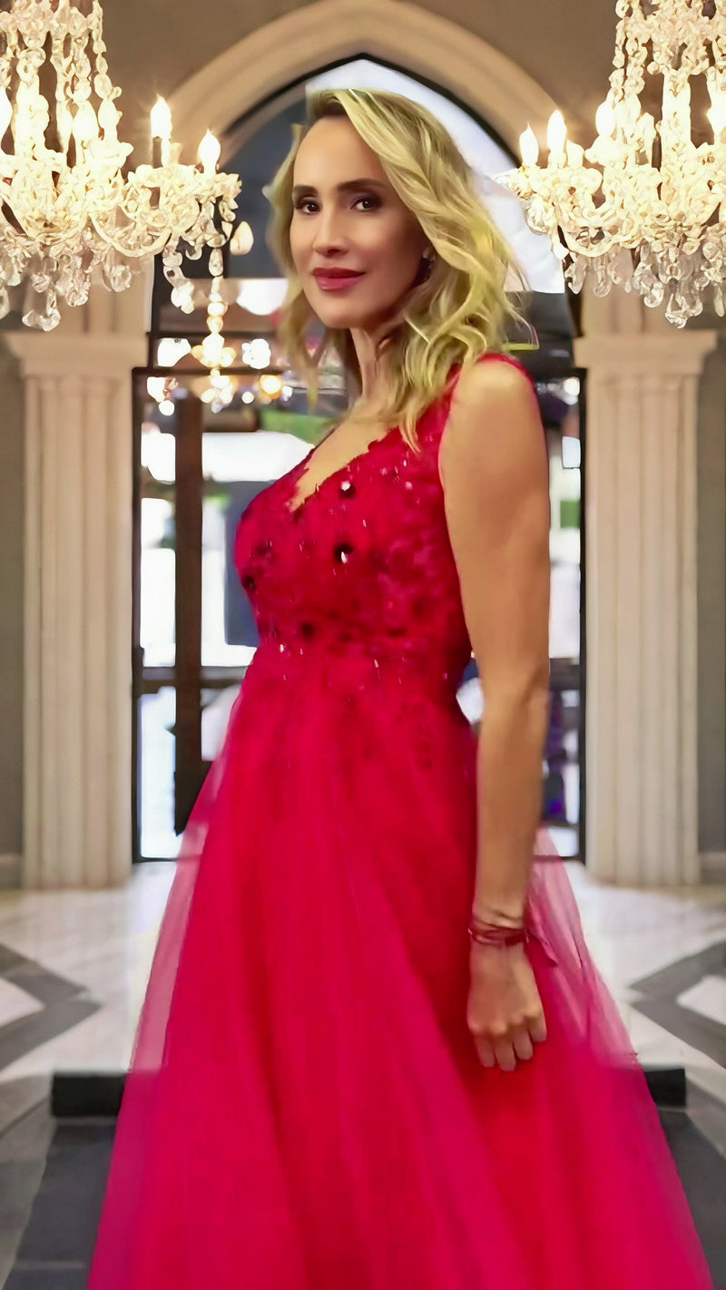 Este vestido largo rojo combina elegancia y detalle artesanal. Su falda de tul con tajo aporta movimiento y sofisticación, mientras que el escote corazón amplio realza la figura con un toque romántico. Los tirantes gruesos en los hombros ofrecen soporte y estilo, complementados por un bordado delicado de lentejuelas y flores que añade un brillo sutil y un acabado exclusivo. Ideal para ocasiones especiales donde se busca un look distinguido y femenino.
