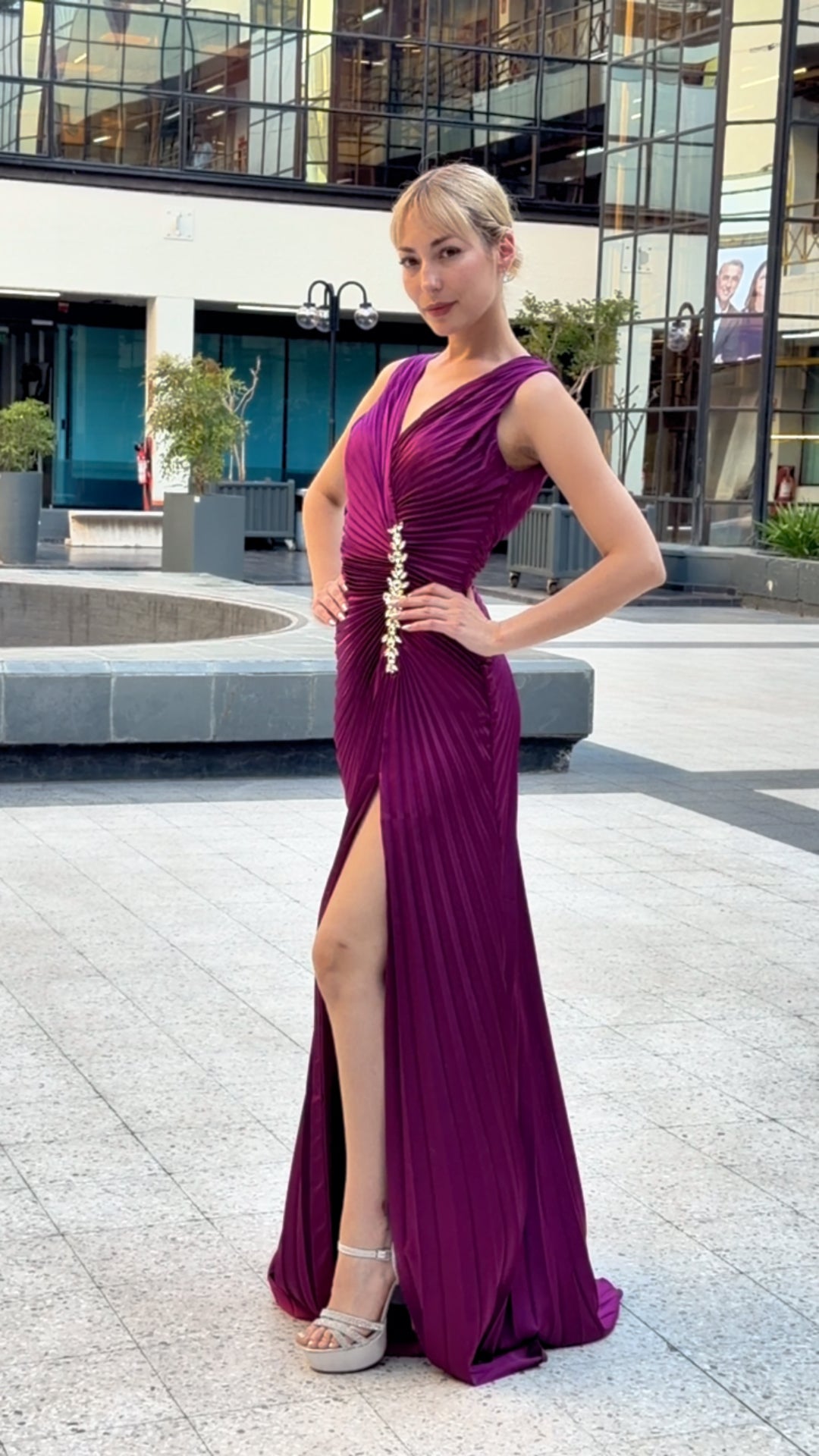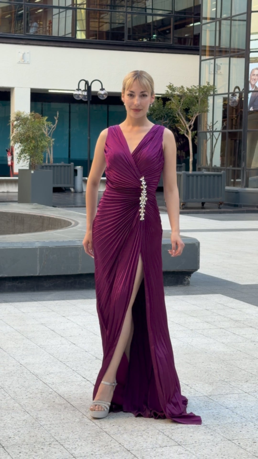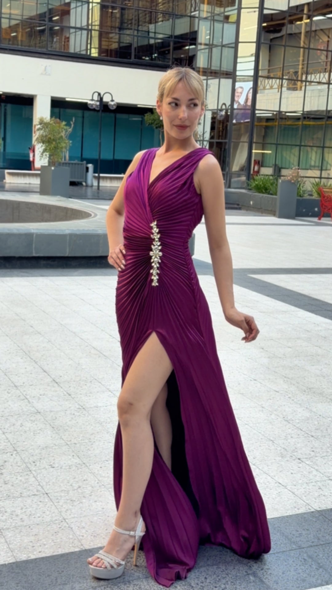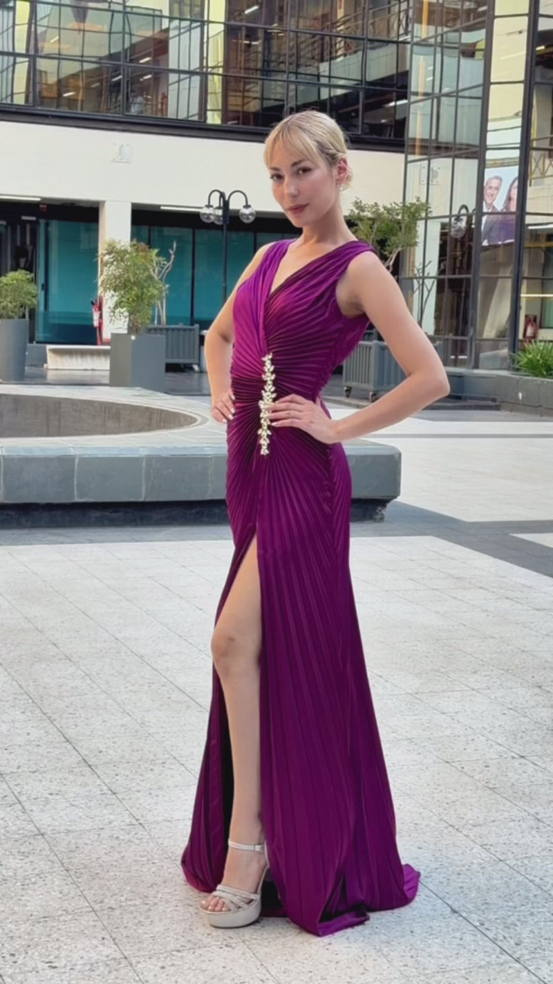 Este vestido largo destaca por su diseño que fusiona plisados con un toque sensual, realzando la figura femenina mediante un efecto envolvente que culmina en una abertura lateral, ideal para eventos de gala y ocasiones que requieren sofisticación y presencia elegante.