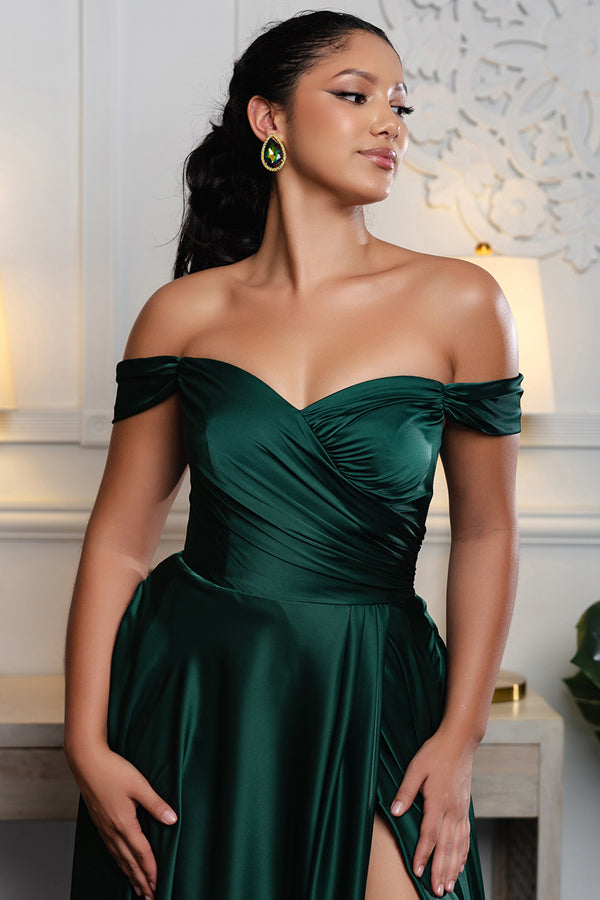 Diseñado para realzar la silueta femenina con un delicado drapeado en el corpiño y mangas off-shoulder que aportan un toque romántico y sofisticado. Su falda larga de caída fluida crea un movimiento hipnótico al caminar, ideal para brillar en bodas, galas o eventos especiales. Un diseño que combina elegancia atemporal con la sensualidad sutil de los detalles cuidados.