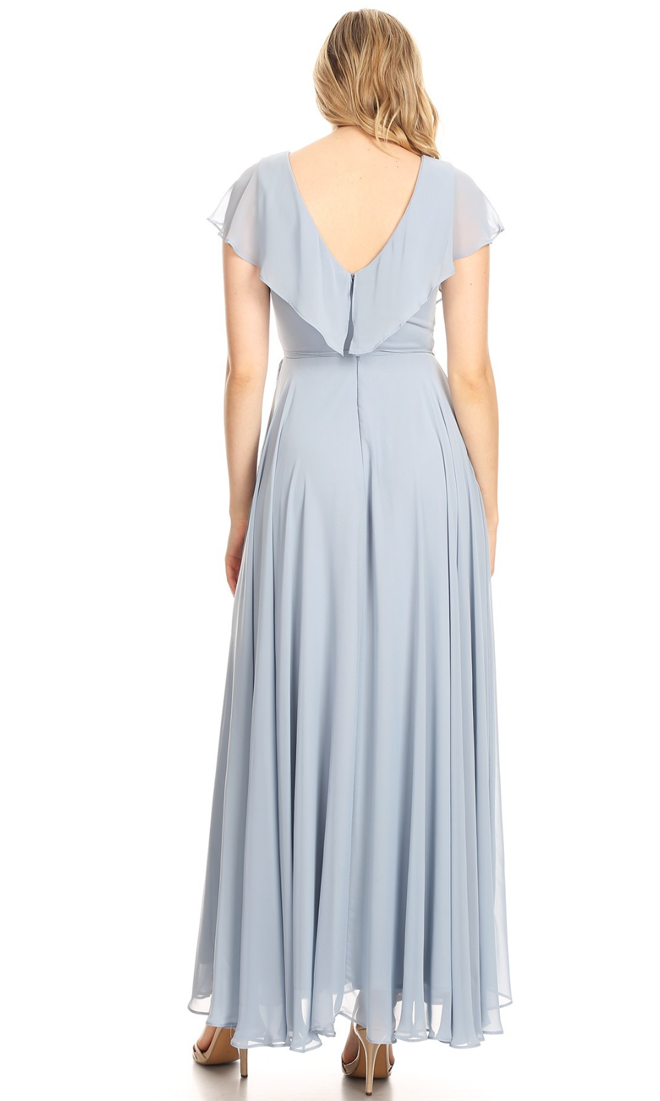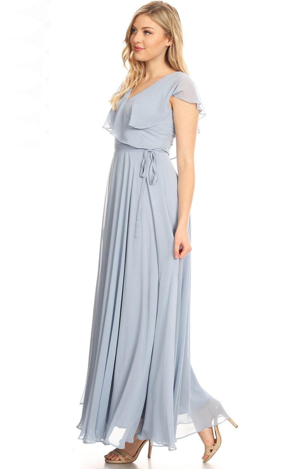 Vestido largo cruzado de gasa escote en v con vuelitos amarrado a un costado.