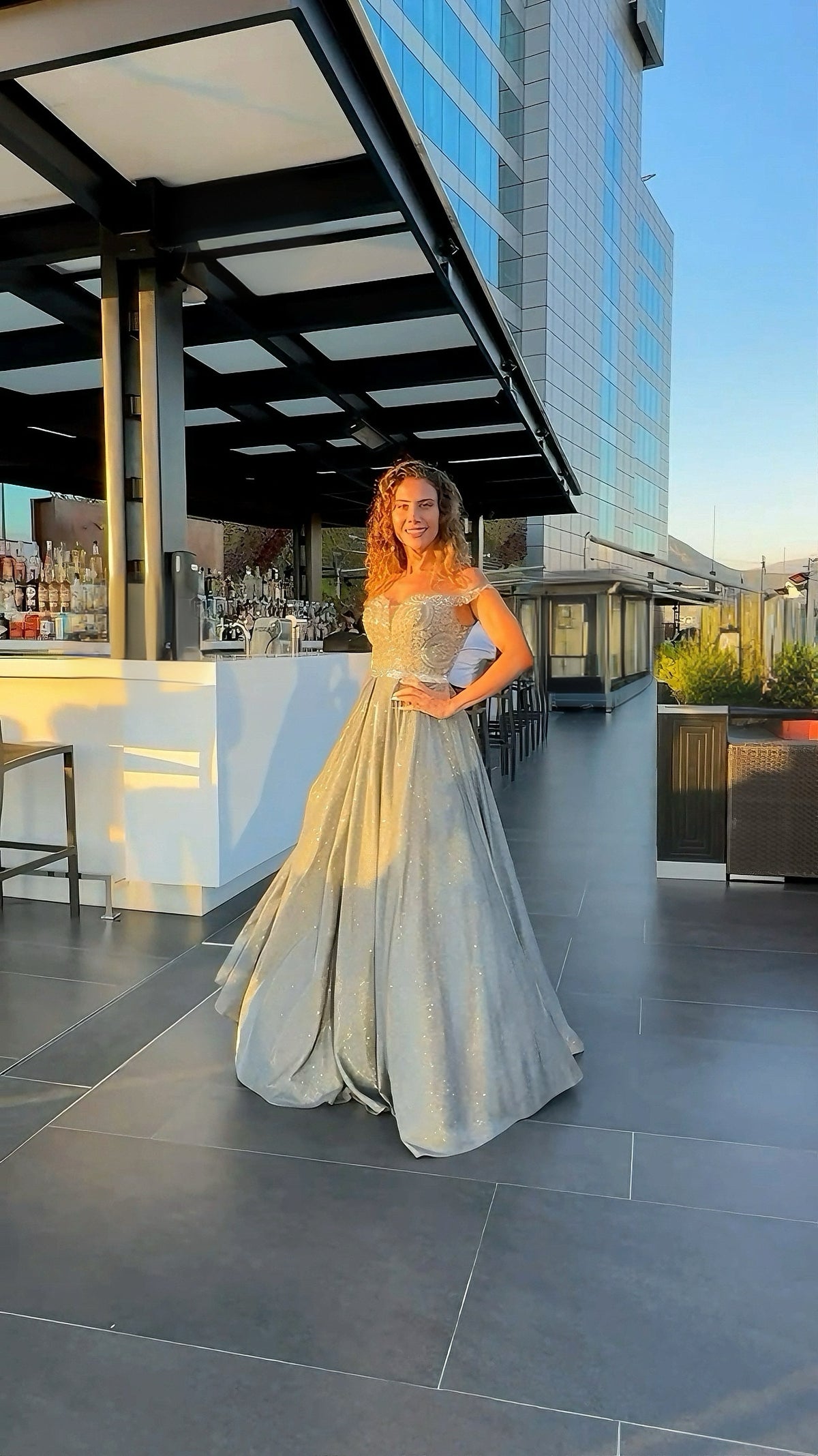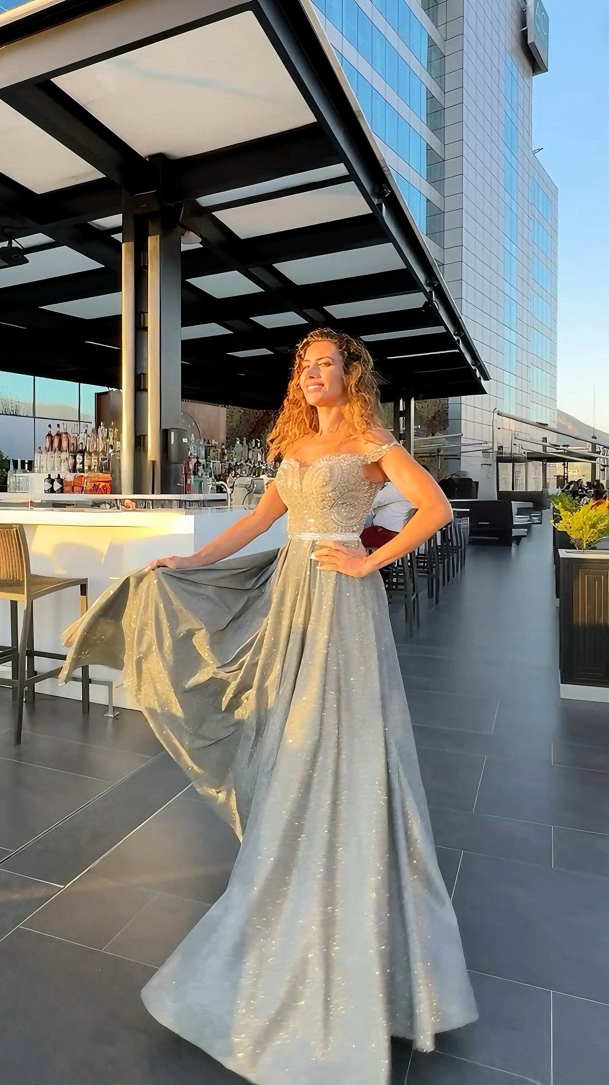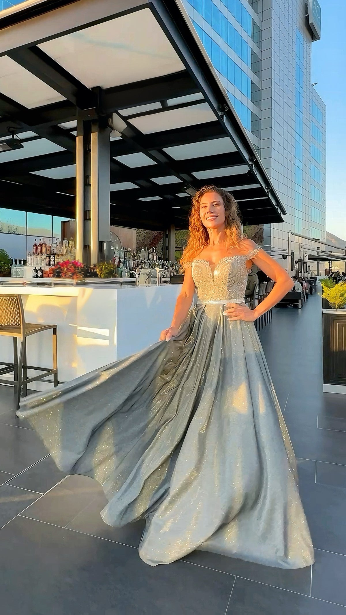 Te presentamos este espectacular vestido largo plateado, diseñado para que deslumbres en tu noche de gala. 🌙🌟 Su corte A, estilo princesa, aporta una silueta mágica que realza tu elegancia, mientras su tela con destellos de luz y detalles en strass lo convierten en una verdadera obra de arte. 💎