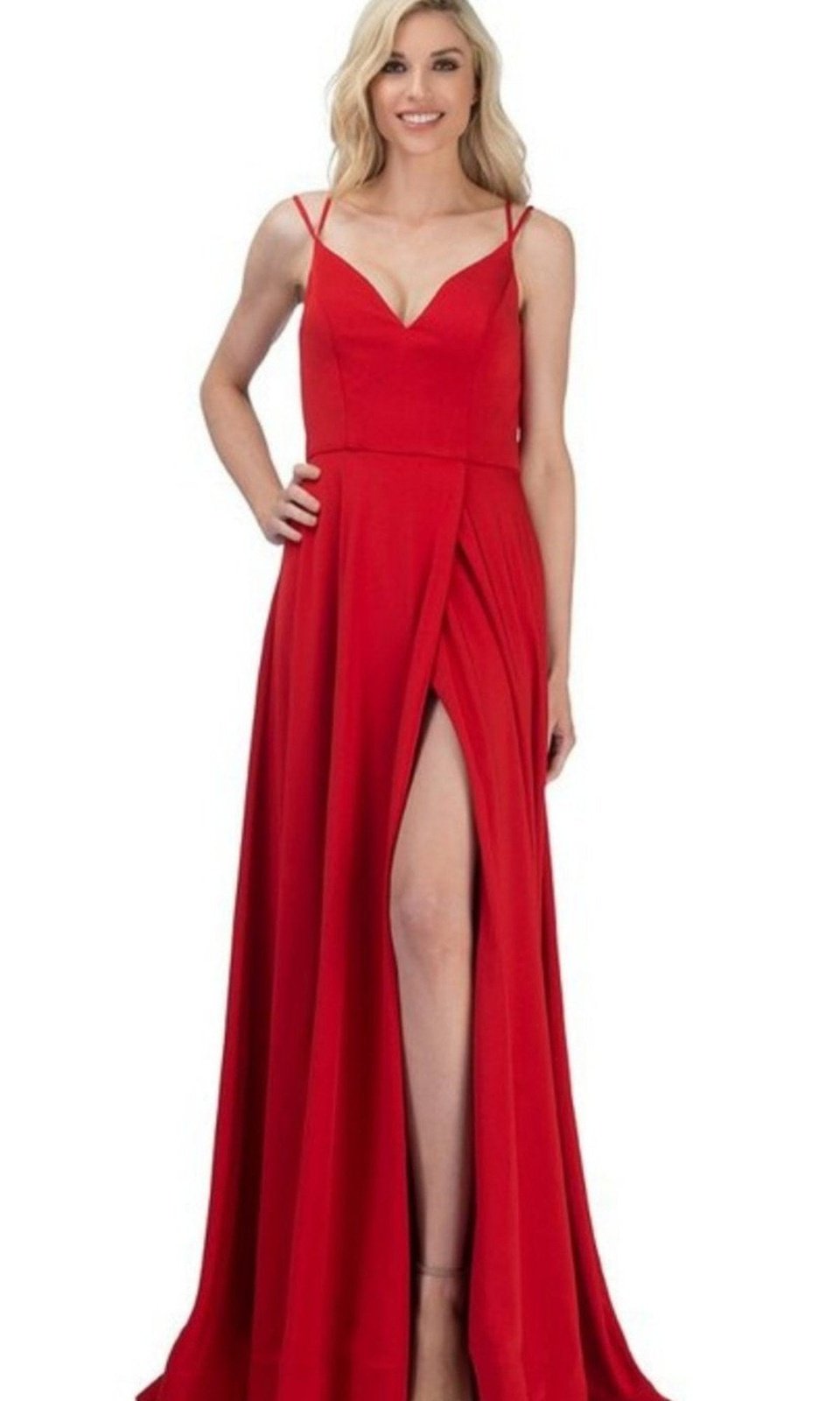 Vestido largo de fiesta rojo de tela suave y de gran caída, corte a y tajo. Vestido largo corte a doble pabilo, escote v rojo l6009.