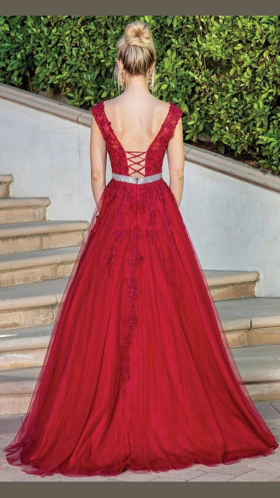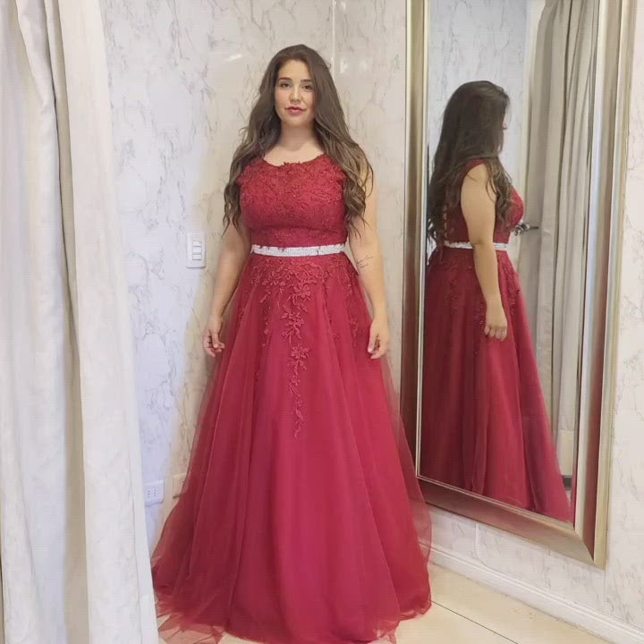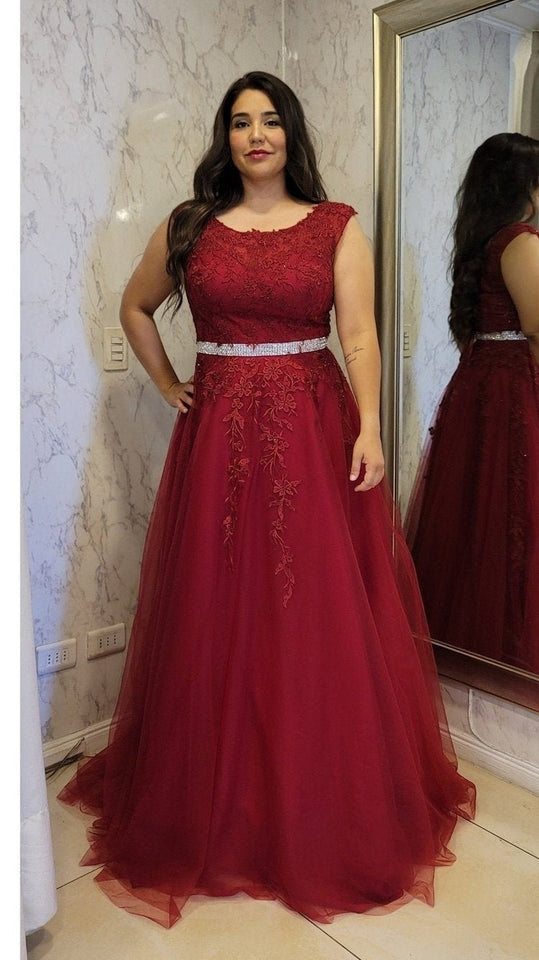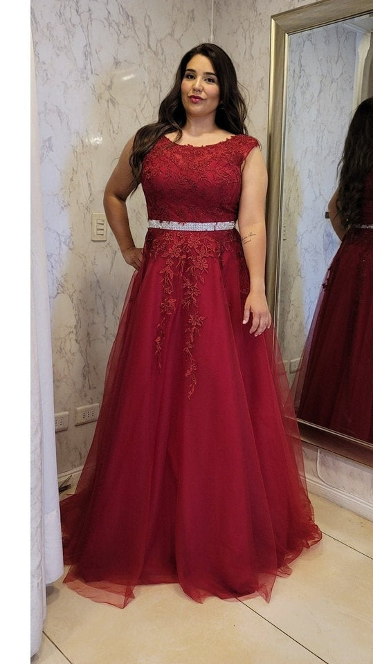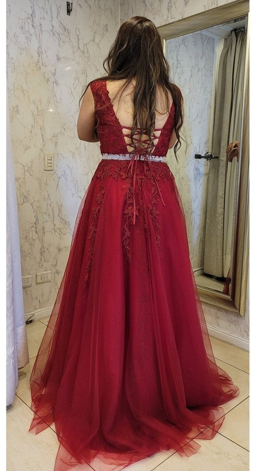 Vestido largo de fiesta con corte a la cintura, en color burdeo con delicados detalles de encaje. Cuenta con un amplio falda que le da un hermoso movimiento, y un corset ajustable en la espalda para un ajuste perfecto. Lucirás elegante y sofisticada en cualquier ocasión especial.