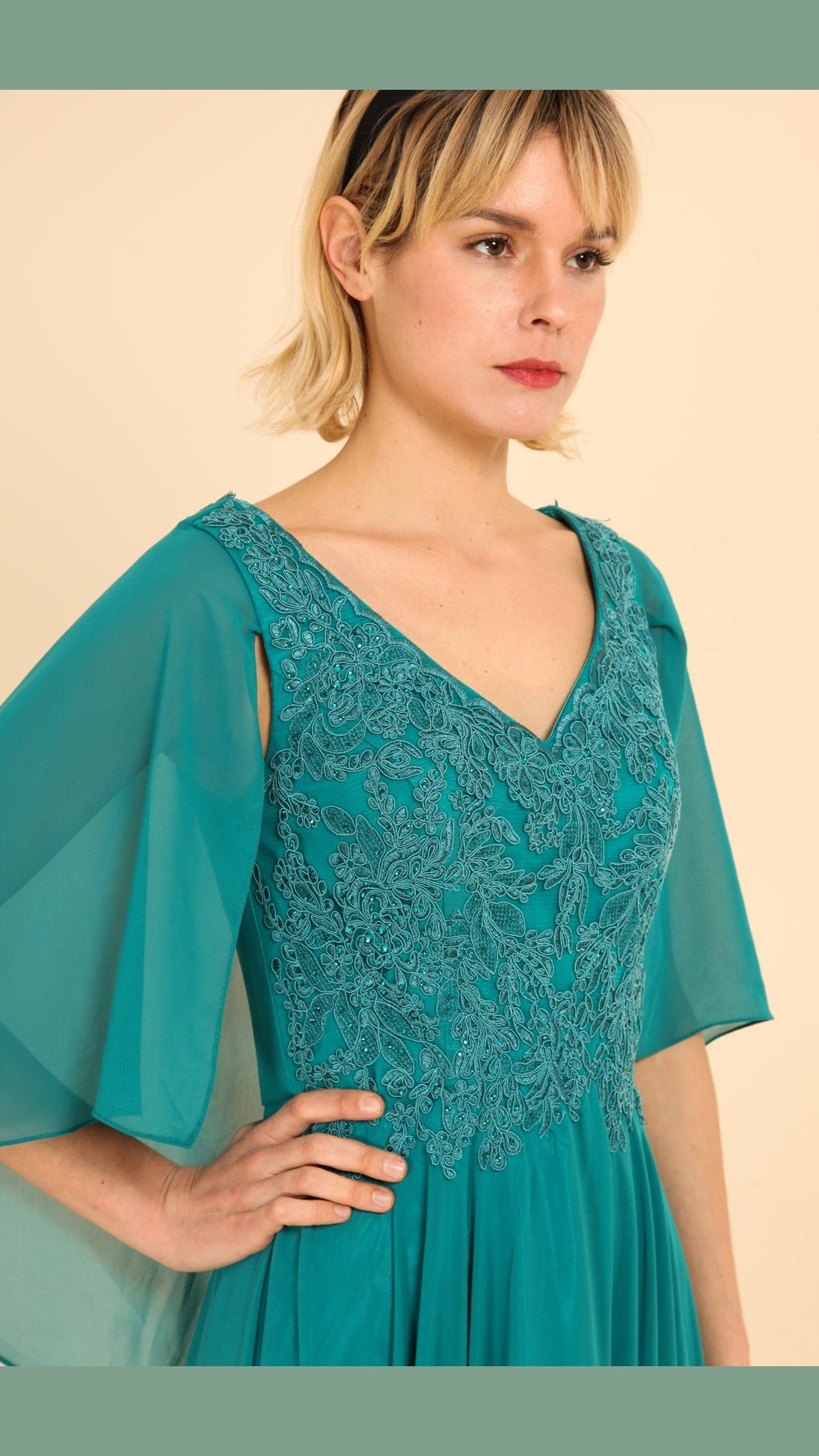 Escote en V: Un diseño clásico y favorecedor que realza el busto con elegancia.