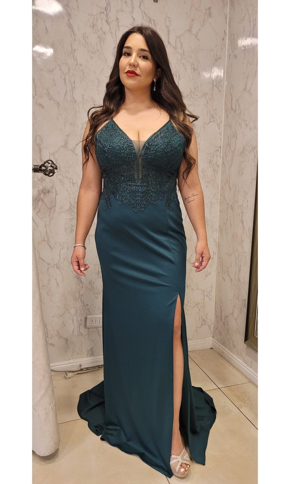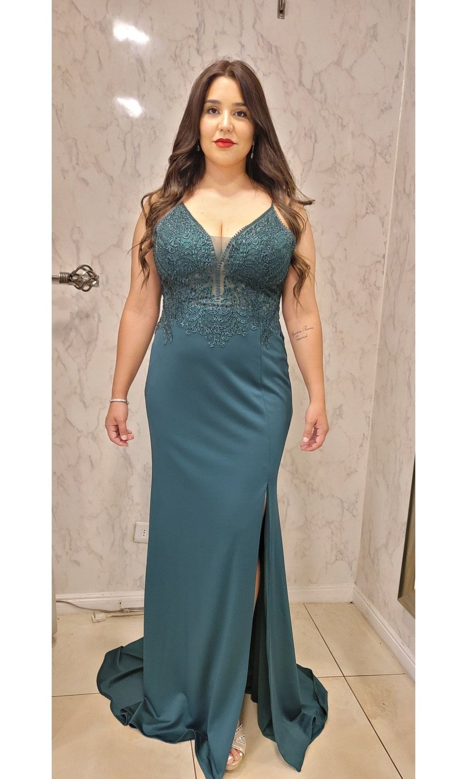 Vestido de fiesta largo corte sirena con escote en V, tajo en la pierna, transparencia bordados y aplicaciones en el torso, queda muy bonito! tremendo calce!