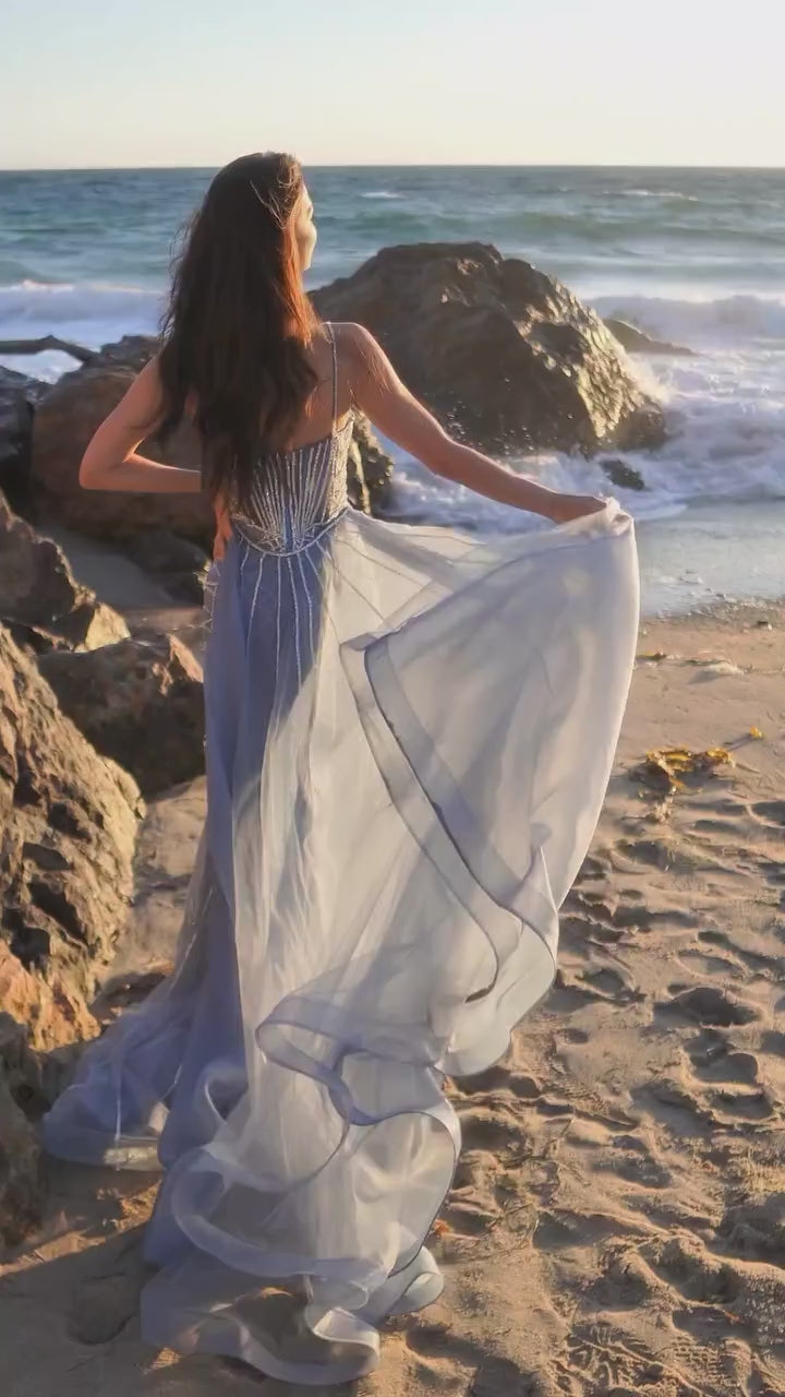Vestido de noche corte sirena, diseñado para deslumbrar con un intrincado bordado en pedrería que dibuja líneas y destellos sobre toda la silueta, creando un efecto luminoso y elegante. Su escote con aplicaciones brillantes y finos tirantes realza el porte, mientras que el faldón trasero de tul, completamente removible, permite transformar el look de majestuoso y dramático a sofisticado y práctico en segundos. Una pieza versátil y de alto impacto, ideal para galas, matrimonios y eventos donde la protagonista eres tú.