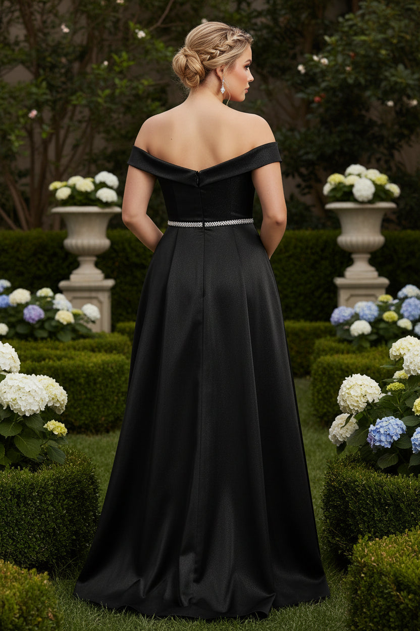 Diseño elegante con falda voluminosa y tela lurex que captura la luz con un brillo refinado. Escote bandeja clásico que favorece el busto, complementado con cinturón de pedrería que define la cintura. Pieza versátil para eventos especiales que combina sofisticación y movimiento.