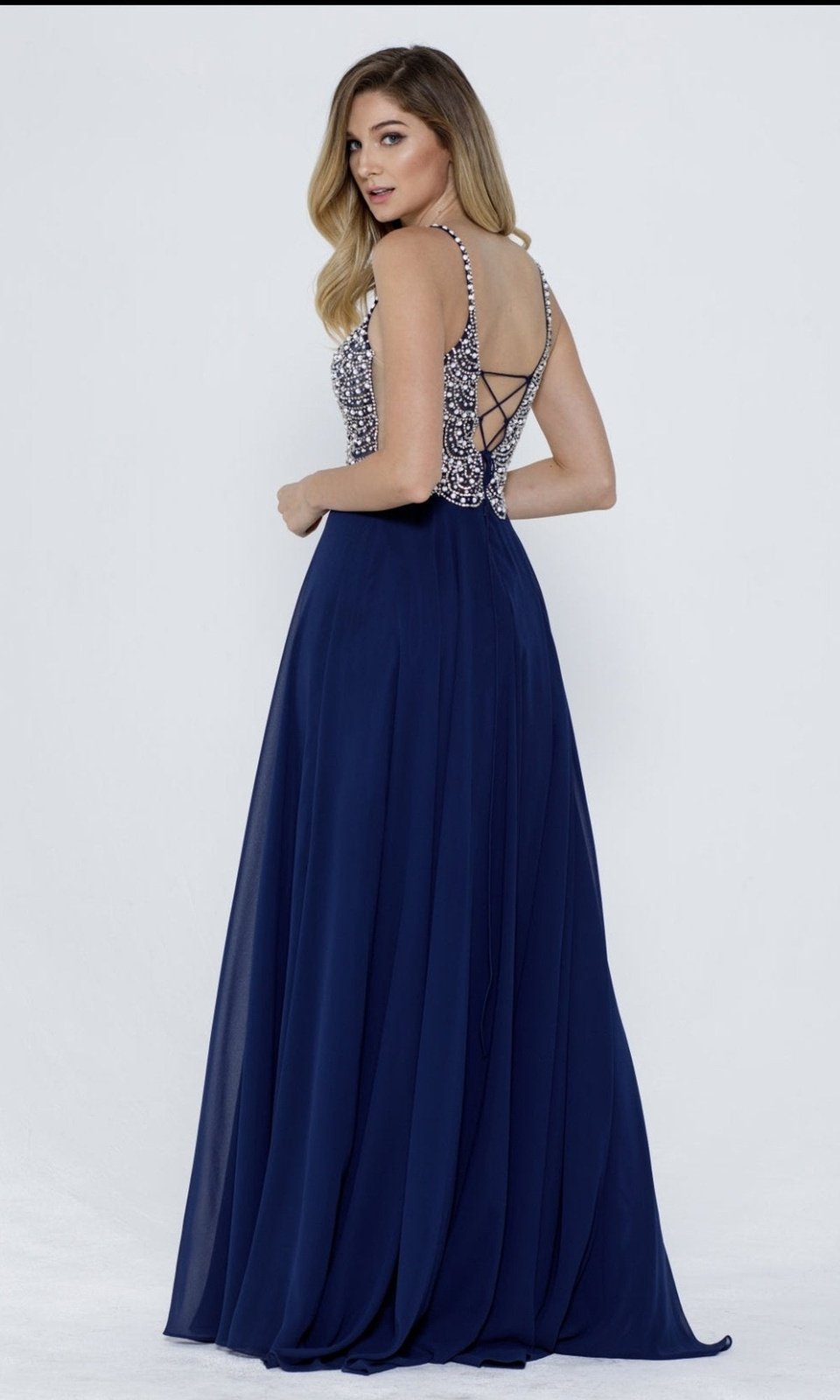 Hermoso vestido largo de gasa con escote en V y transparencia, tirantes cubiertos con piedras brillantes que dan una apariencia muy elegante y sutil, por atrás lleva estilo corset.
