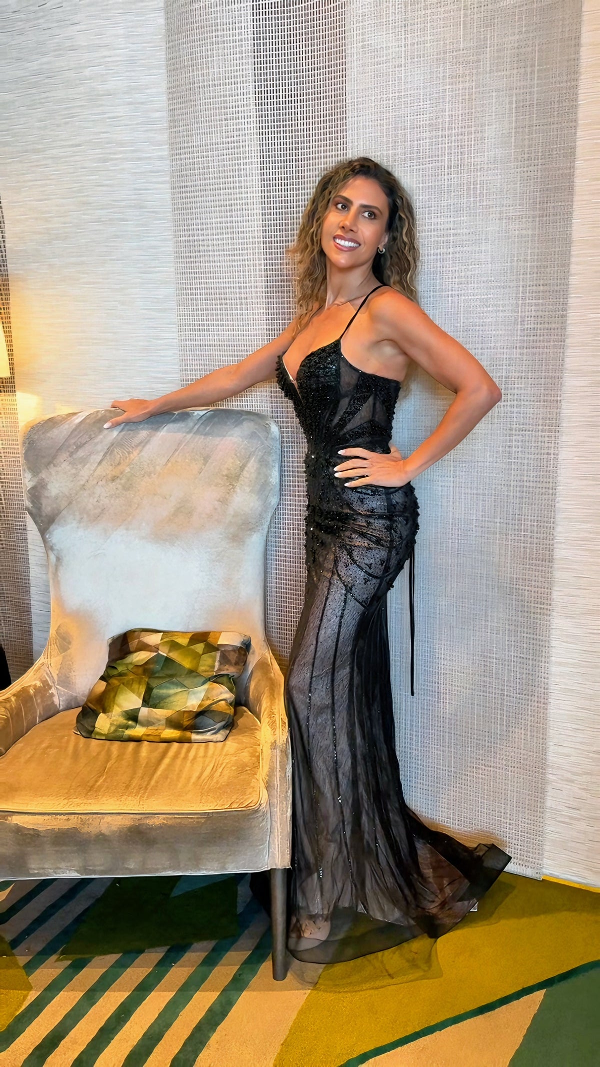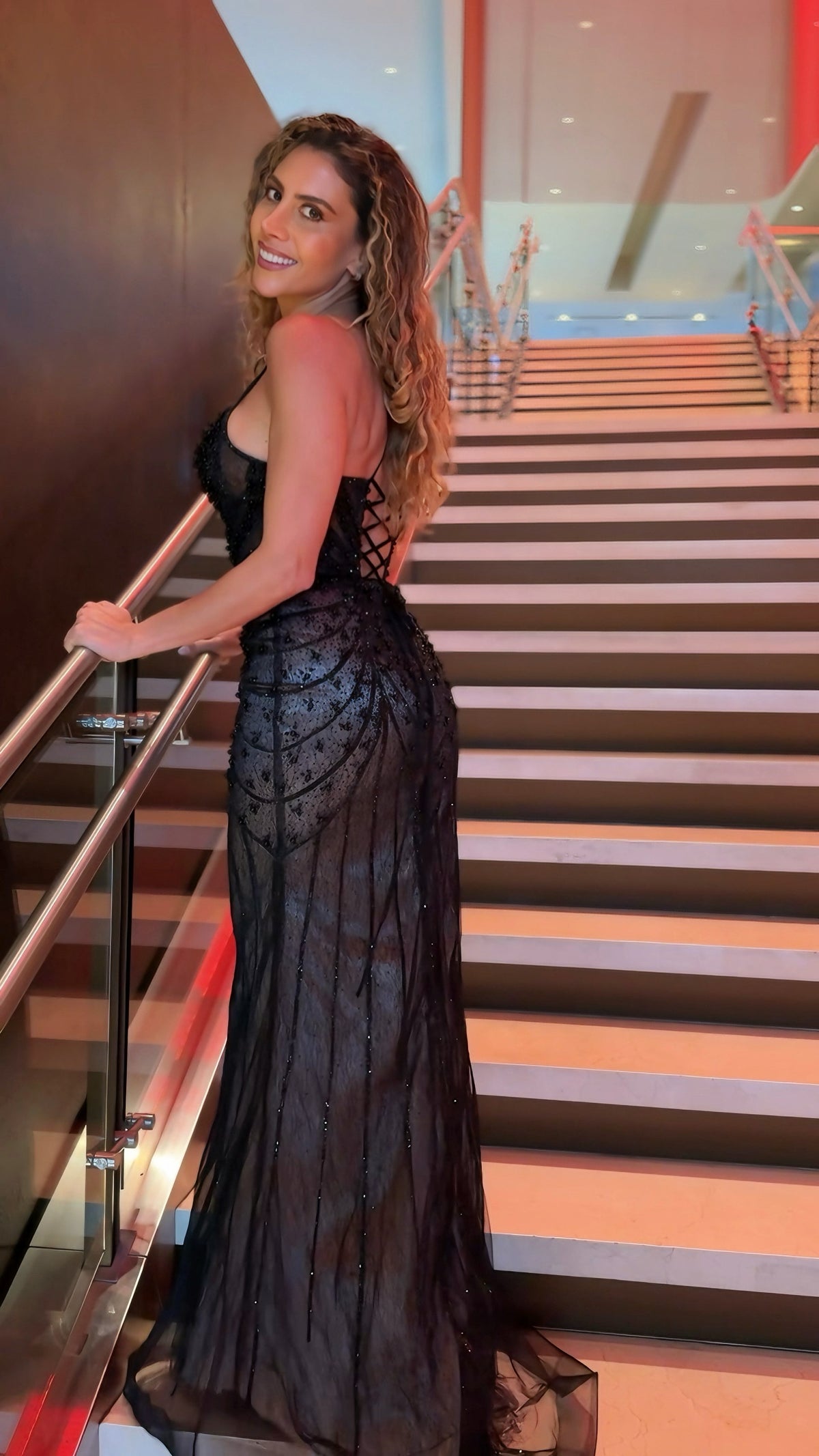 Un verdadero espectáculo de brillo y glamour. Este diseño abraza la figura con una silueta entallada que estiliza al máximo, mientras los intrincados bordados con pedrería y canutillos crean un efecto geométrico de lujo absoluto. El escote profundo con tul ilusión equilibra sensualidad y sofisticación, y la falda fluida con ligera cola añade un toque de majestuosidad. Ideal para brillar en galas, alfombras rojas o eventos donde quieras dejar una huella imborrable.