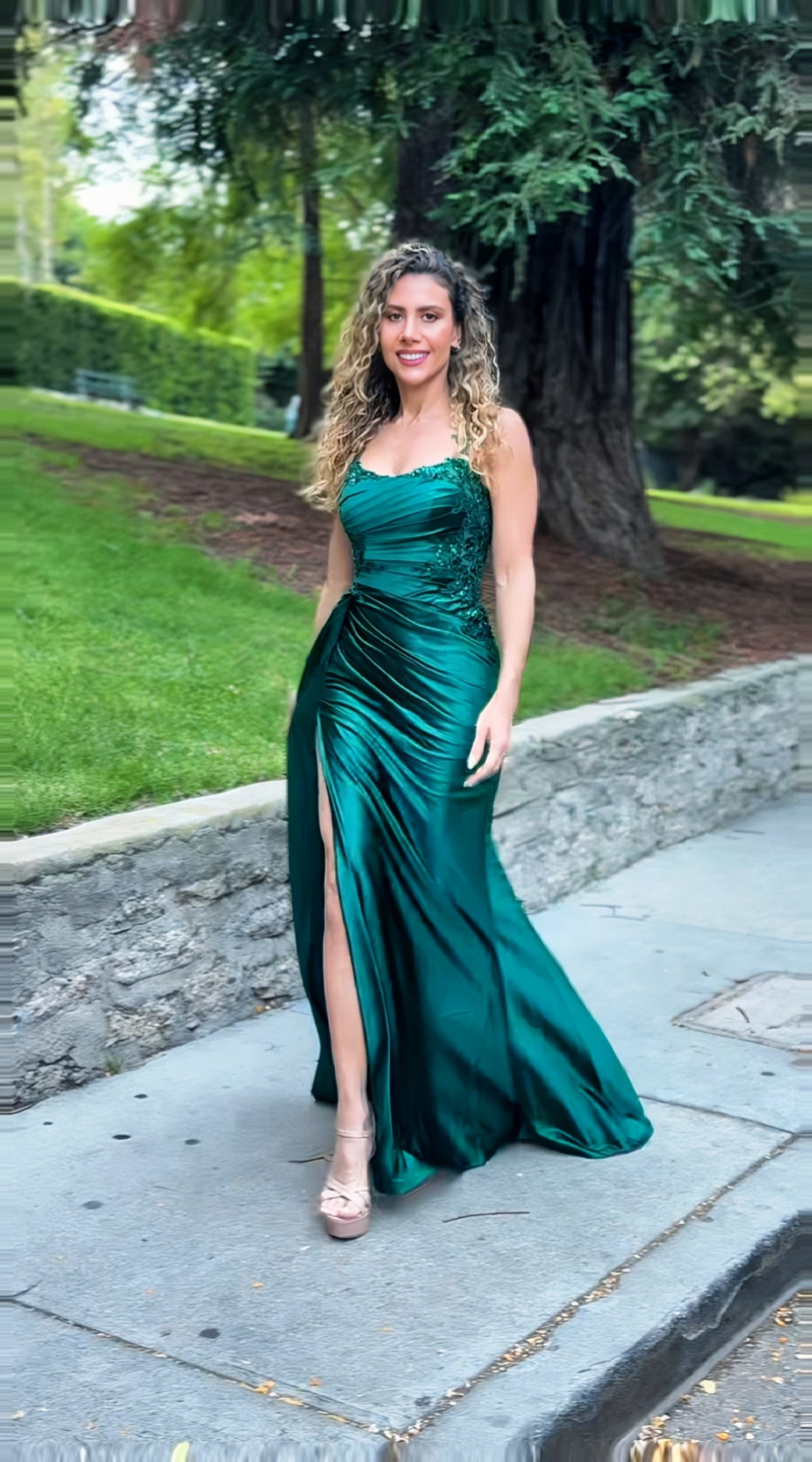 Este vestido de fiesta es una verdadera joya de alta costura, confeccionado en satén de acabado líquido que envuelve la silueta con un brillo hipnótico y una caída impecable. Su escote delicadamente adornado con apliques florales bordados realza el busto con un toque romántico, mientras los finos tirantes y el drapeado lateral esculpen la figura con elegancia. La falda fluida se despliega en una cola sutil que aporta majestuosidad a cada movimiento, convirtiéndolo en la elección perfecta para galas, matrimonios o eventos donde solo lo mejor es suficiente. ✨💫