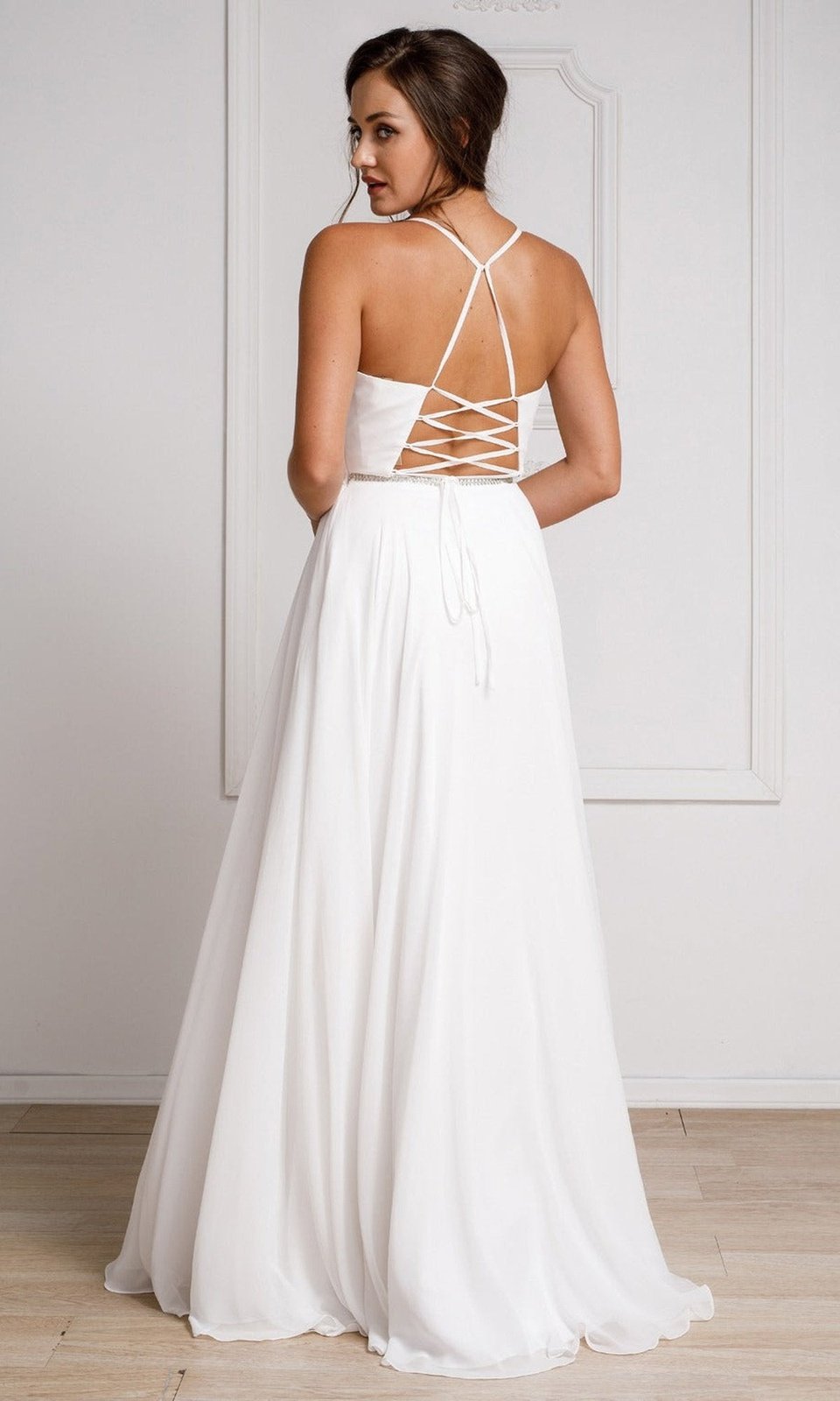 Vestido largo de gasa con escote en V, espalda descubierta estilo corset, los tirantes finos se unen en un broche en la espalda para dar forma a una espalda en T antes de dar lugar a un sensual detalle de cordones. Cierre / cremallera lateral oculta. cintura adornada con piedras le da un toque glamuroso, fluye desde las caderas y se abre en una abertura lateral que le da un toque romántico.