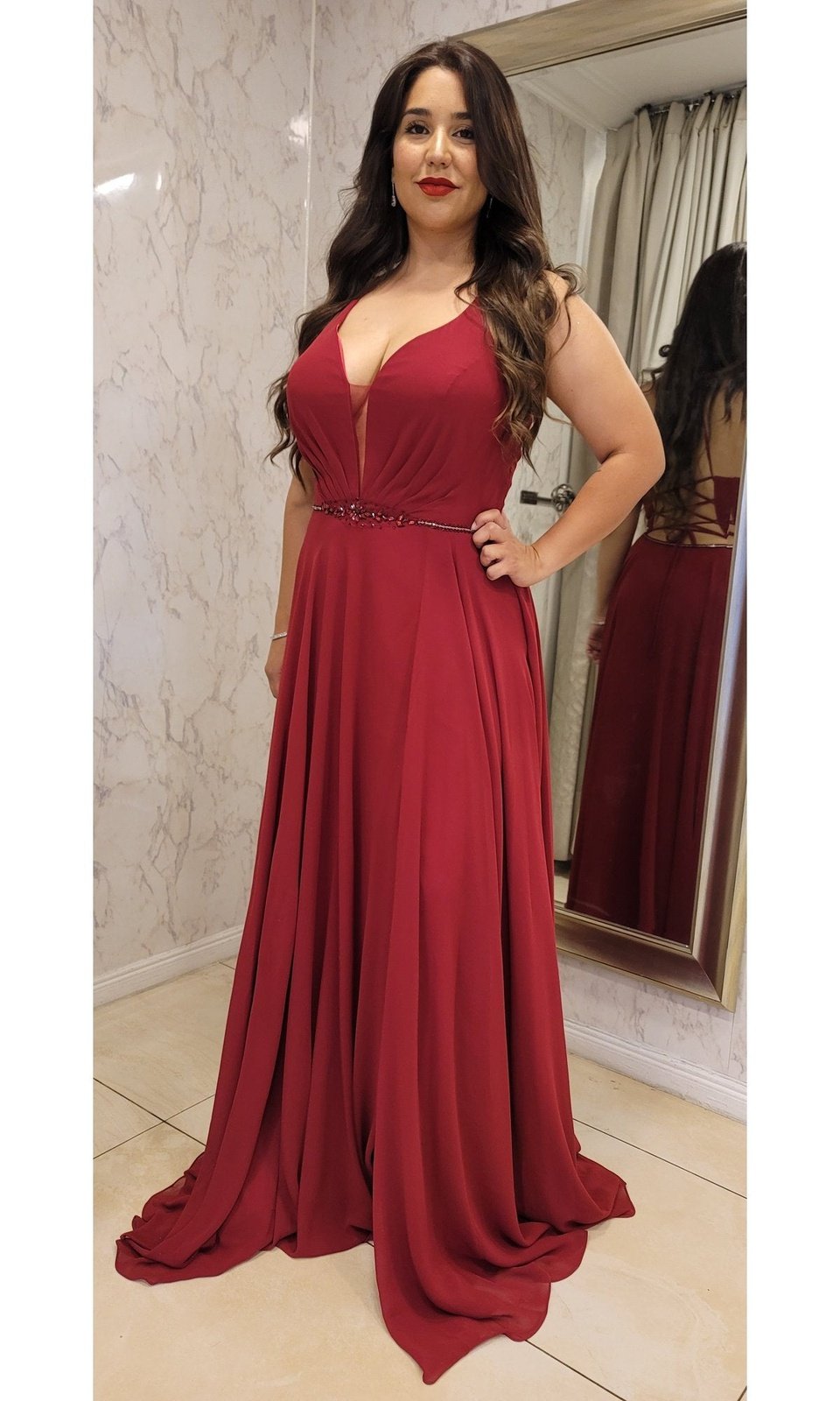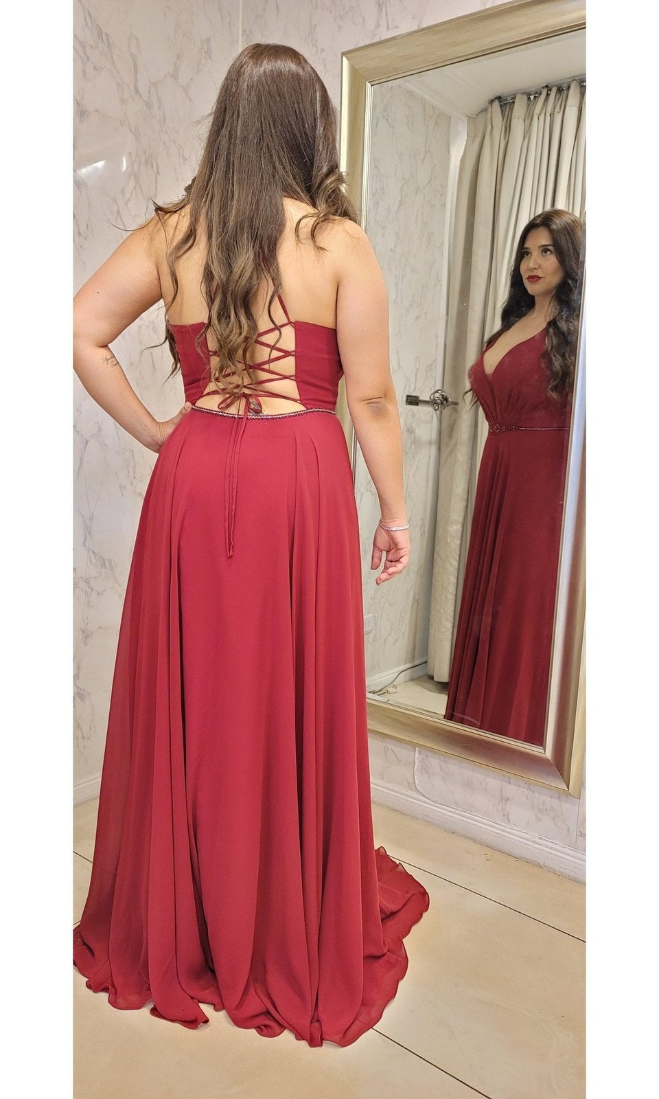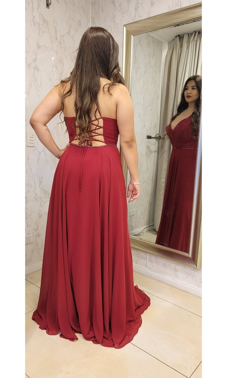 Vestido largo de gasa con escote en V, espalda descubierta estilo corset, los tirantes finos se unen en un broche en la espalda para dar forma a una espalda en T antes de dar lugar a un sensual detalle de cordones. Cierre / cremallera lateral oculta. cintura adornada con piedras le da un toque glamuroso, fluye desde las caderas y se abre en una abertura lateral que le da un toque romántico.