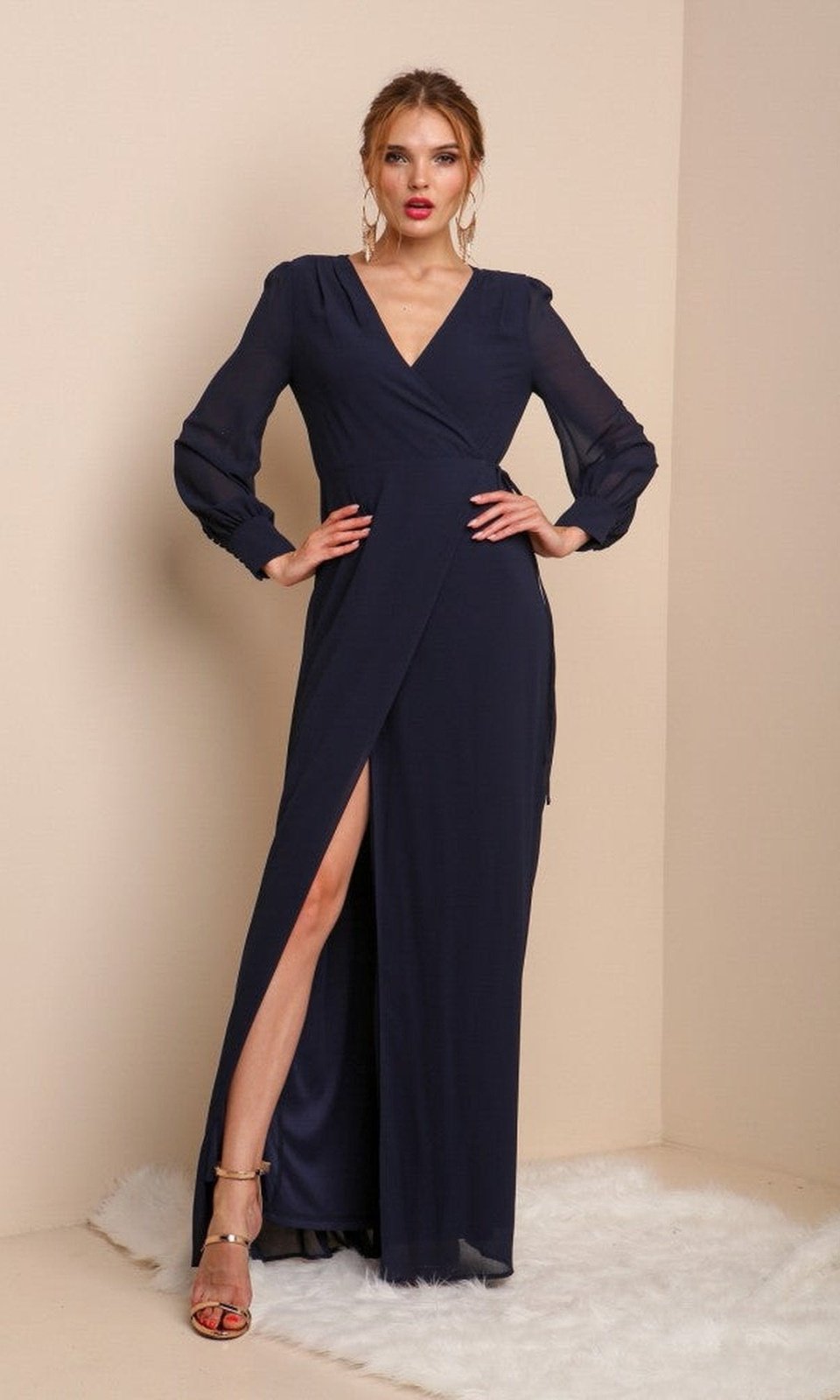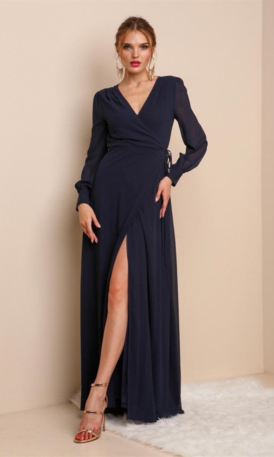 Bello vestido de gasa con mangas, escote en V, tajo en una pierna, botones en los puños de las mangas, espalda cerrada.