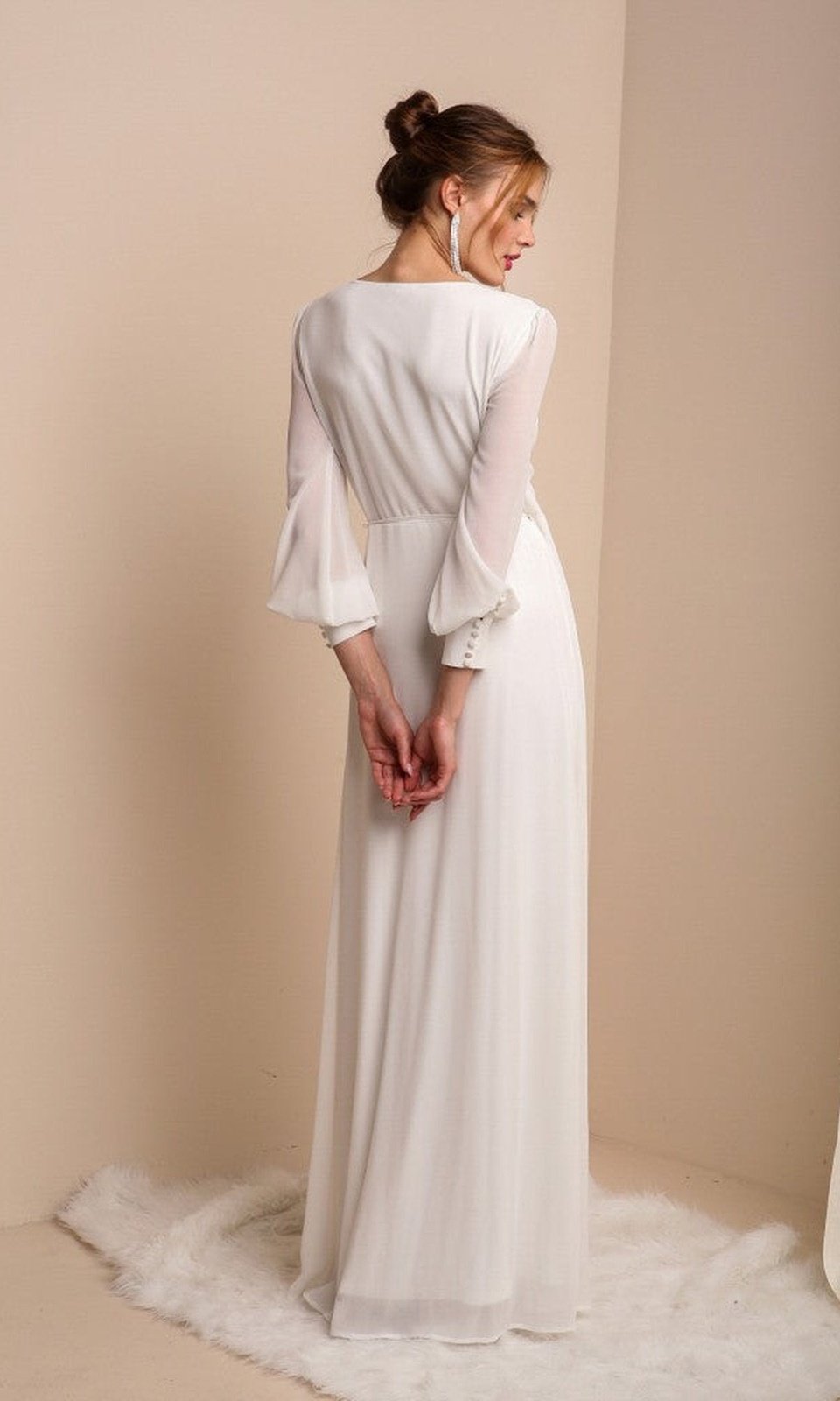 Bello vestido de gasa con mangas, escote en V, tajo en una pierna, botones en los puños de las mangas, espalda cerrada.