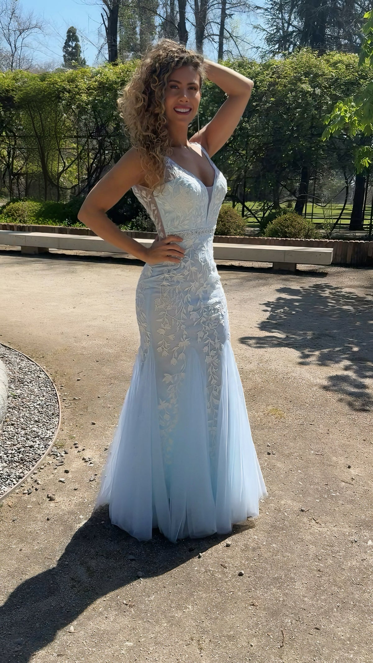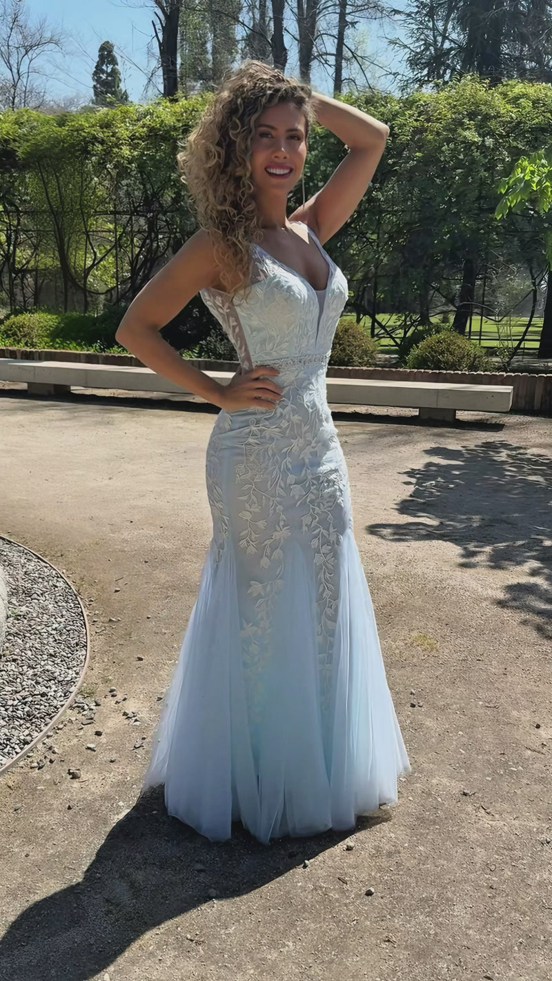 Este vestido largo en tono celeste presenta un corte sirena que realza la figura con elegancia. Confeccionado en tul delicado y bordado detallado, destaca por su escote en V profundo que aporta sofisticación. El cinturón con pedrería añade un toque de brillo sutil, mientras que los tirantes con transparencia ofrecen un acabado moderno y refinado, ideal para ocasiones especiales donde se busca un estilo distinguido y femenino.