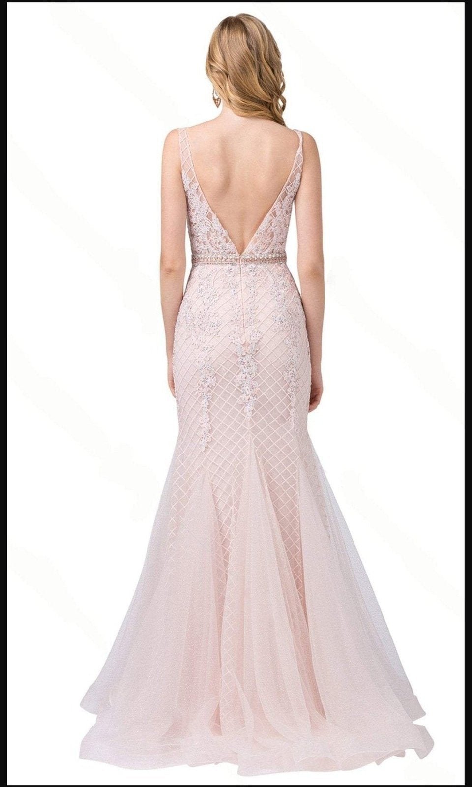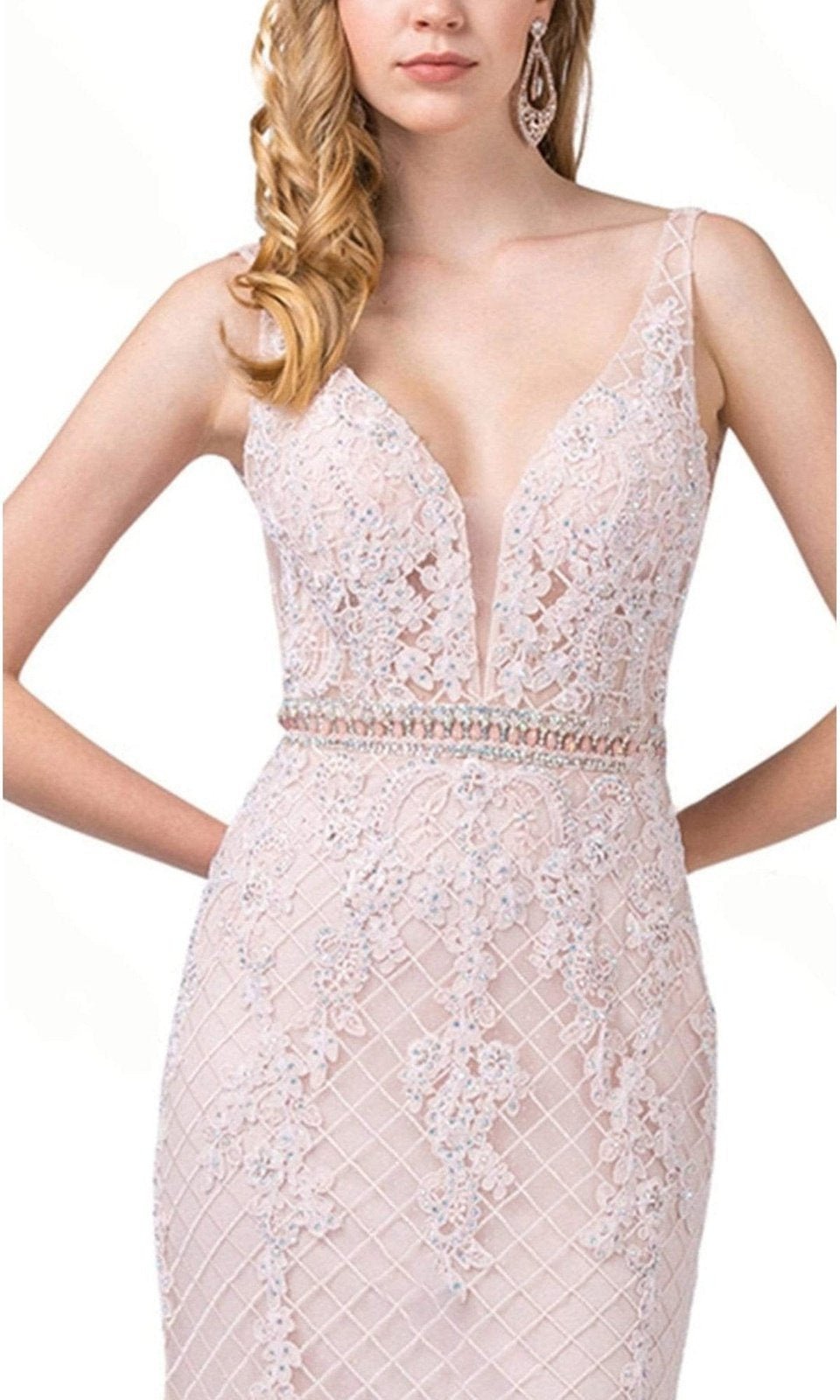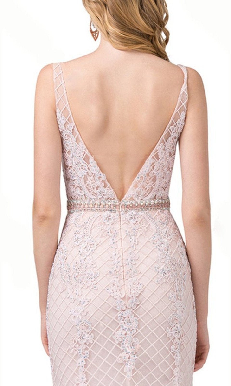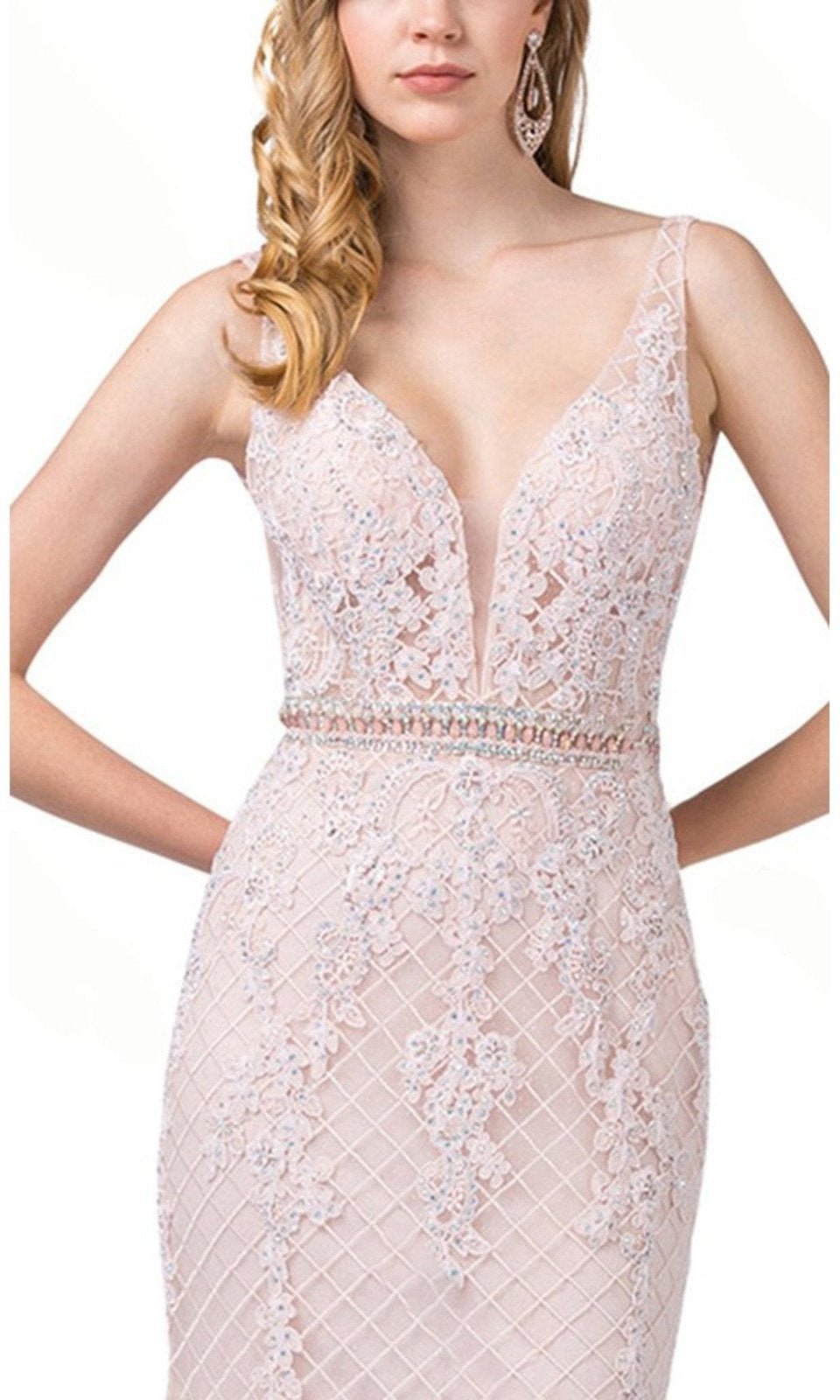 Vestido diseñado con bordados de encaje con detalles de piedras brillantes, el corpiño ajustado revela un escote en V pronunciado con detalles transparentes en el busto y espalda en V abierta. Los adornos de brillantes rodean la cintura natural mientras el tul adorna la falda de sirena.