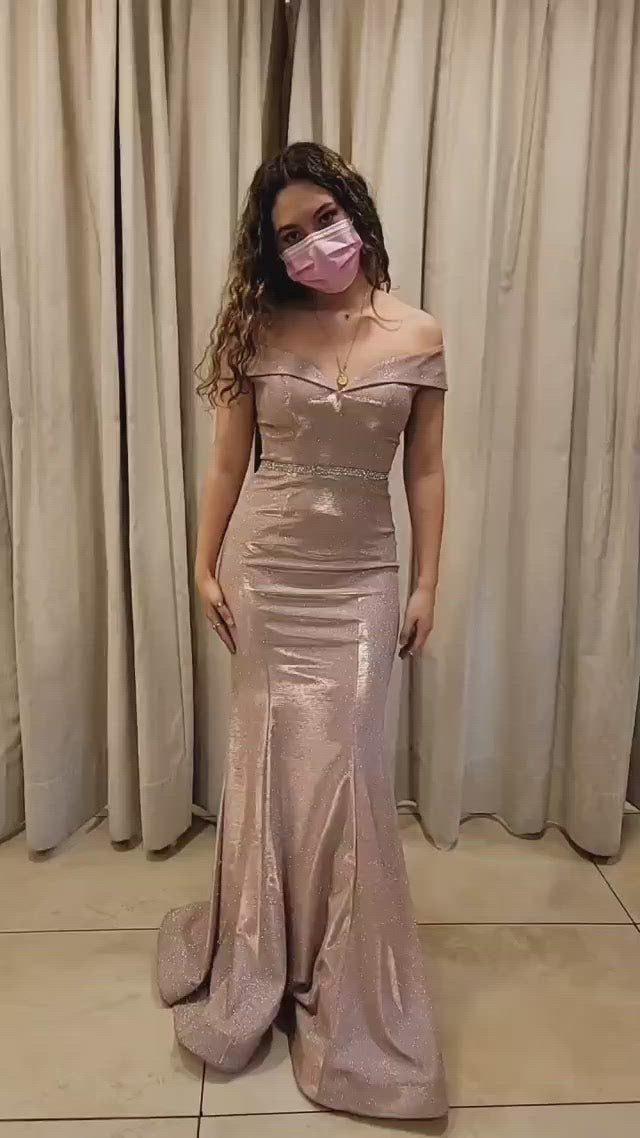 Vestido largo escote pronunciado fuera del hombro con un corpiño ajustado ceñido en un cinturón adornado. La espalda tiene un cierre de cremallera y desde la cintura comienza una falda de trompeta de cuerpo entero.