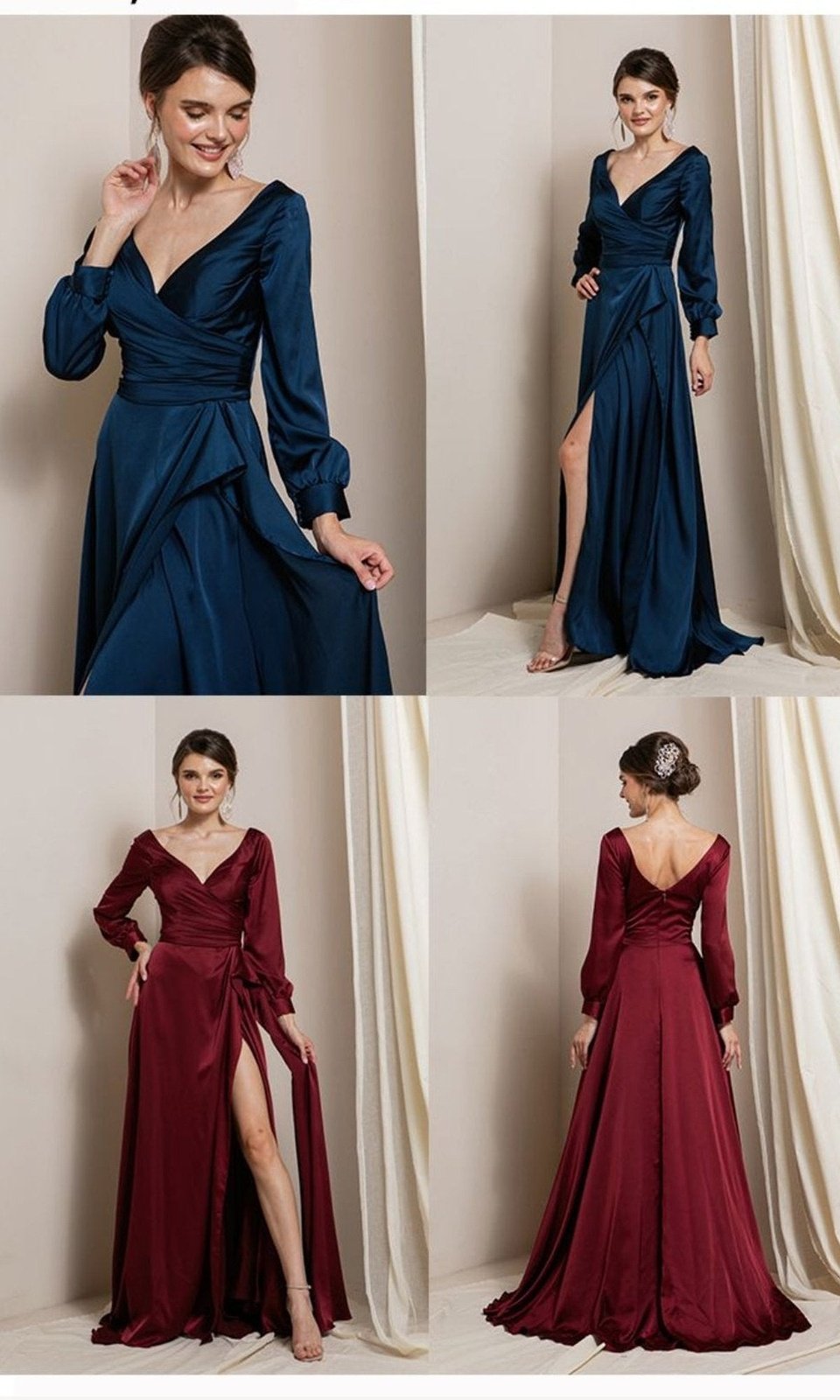 Bello vestido de satin con mangas, escote en V y cintura plisada, tajo en una pierna, botones en los puños de las mangas, espalda con el mismo escote en V. Disponible en burdeo.