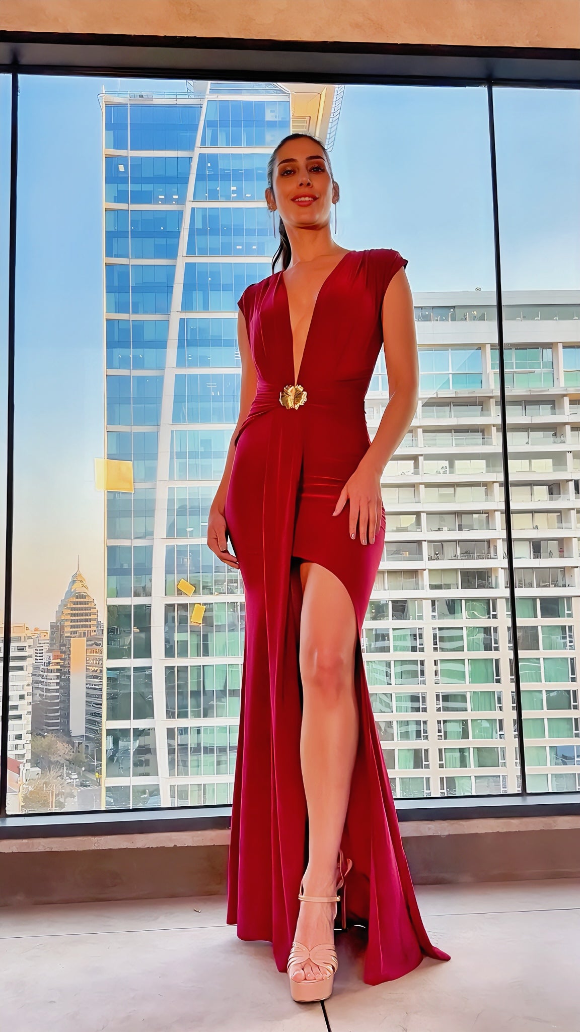 Este vestido largo Valentina combina elegancia y sensualidad con su escote en V profundo y un atrevido tajo que realza la figura. Confeccionado en lycra elasticada, ofrece comodidad y ajuste perfecto. Sus hombros cuentan con hombreras que aportan estructura, mientras que el detalle central de una flor dorada metálica añade un toque sofisticado y único. Ideal para ocasiones especiales donde destacar con estilo y confianza.