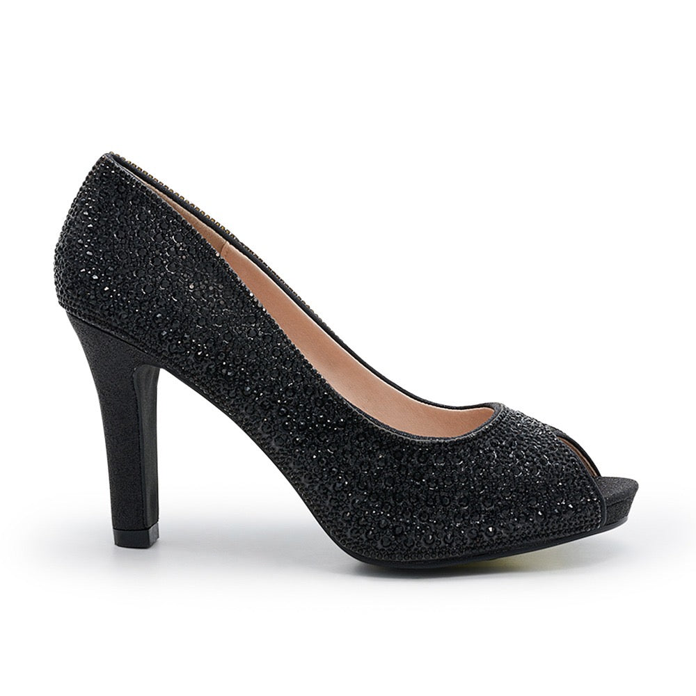 Zapato de fiesta con tacón alto y diseño peep toe, cubierto de finos cristales negros que aportan un brillo elegante y sofisticado. Su plataforma interna ofrece comodidad extra, ideal para lucir en bodas, cócteles y eventos nocturnos, combinando estilo, altura y glamour en cada paso.