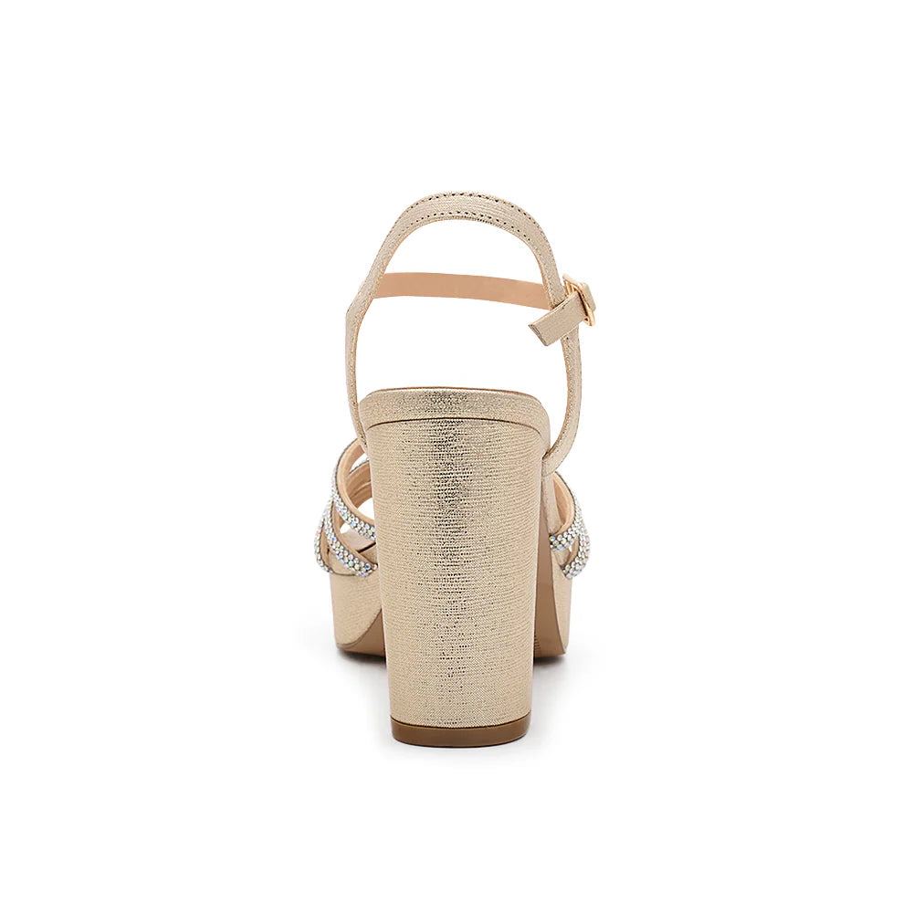Sandalia de plataforma con tacón ancho alto, decorada con tiras finas cubiertas de cristales que se cruzan en un elegante diseño central. La pulsera ajustable al tobillo brinda comodidad y firmeza, perfecta para bodas, graduaciones y eventos nocturnos donde el brillo y la sofisticación son protagonistas.