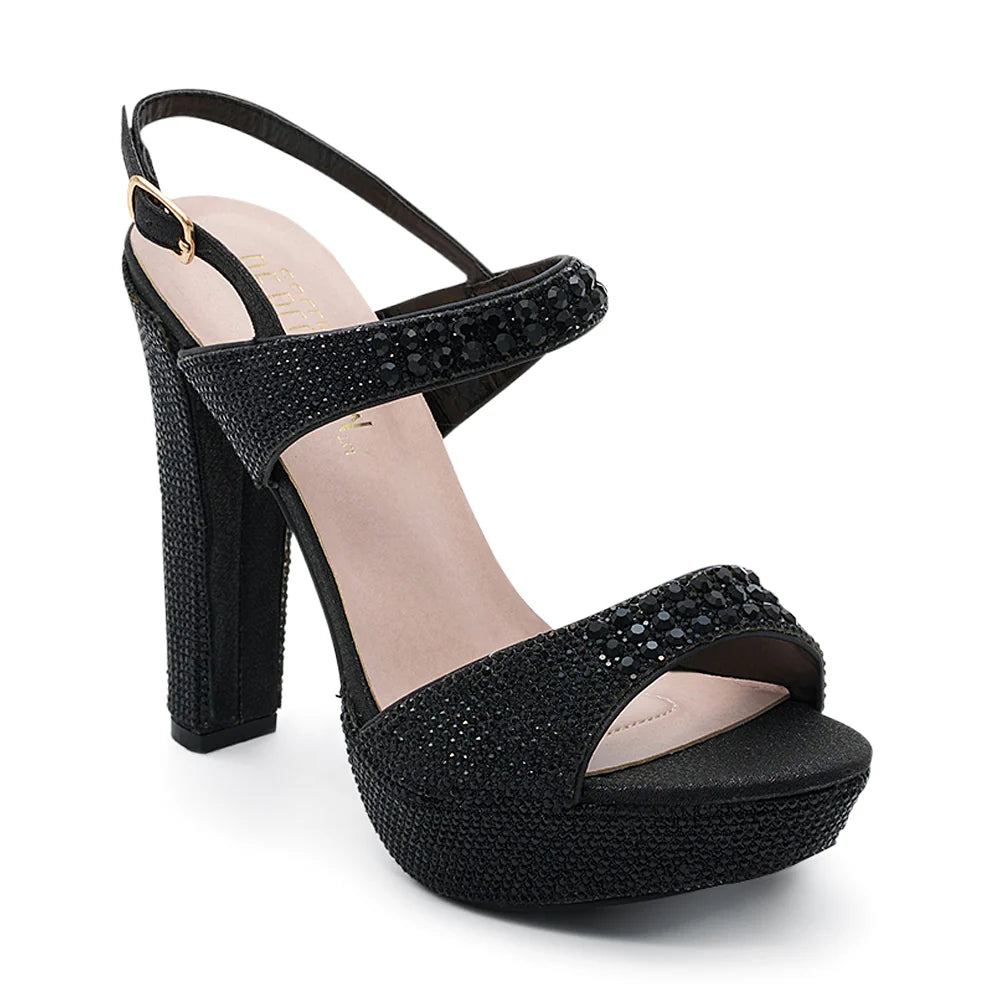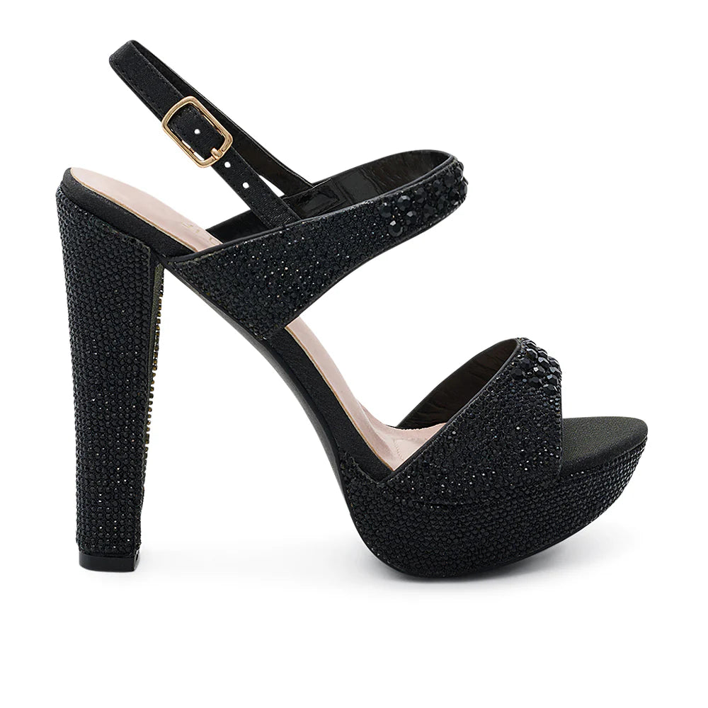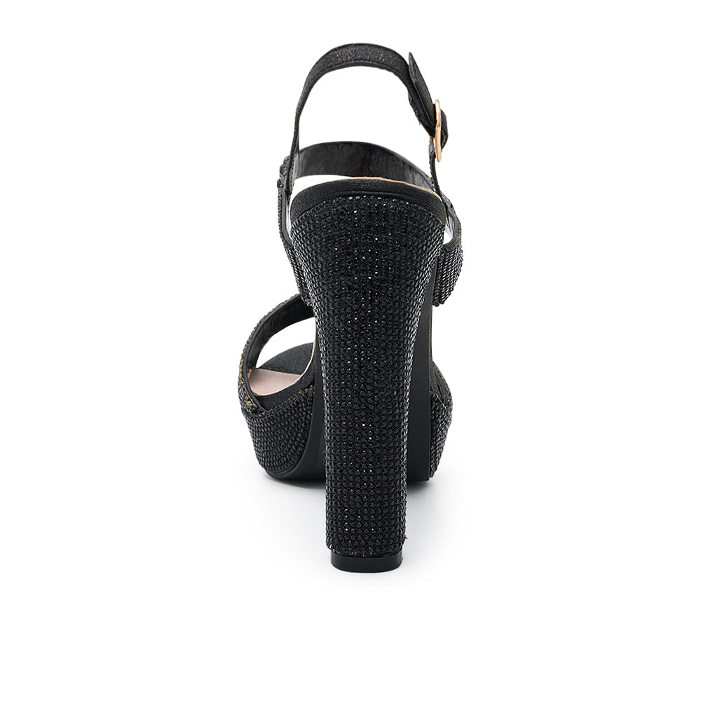 Sandalia de plataforma para fiesta con tacón alto ancho, decorada con cristales negros que aportan brillo y elegancia. Su diseño con pulsera cruzada y ajuste al tobillo garantiza comodidad y estabilidad, perfecta para bodas, graduaciones y eventos nocturnos donde el glamour es protagonista.