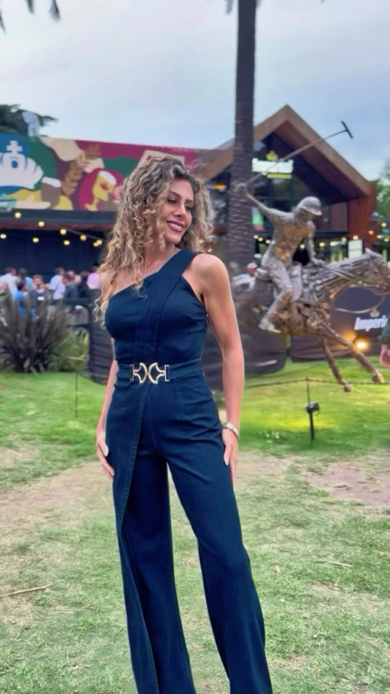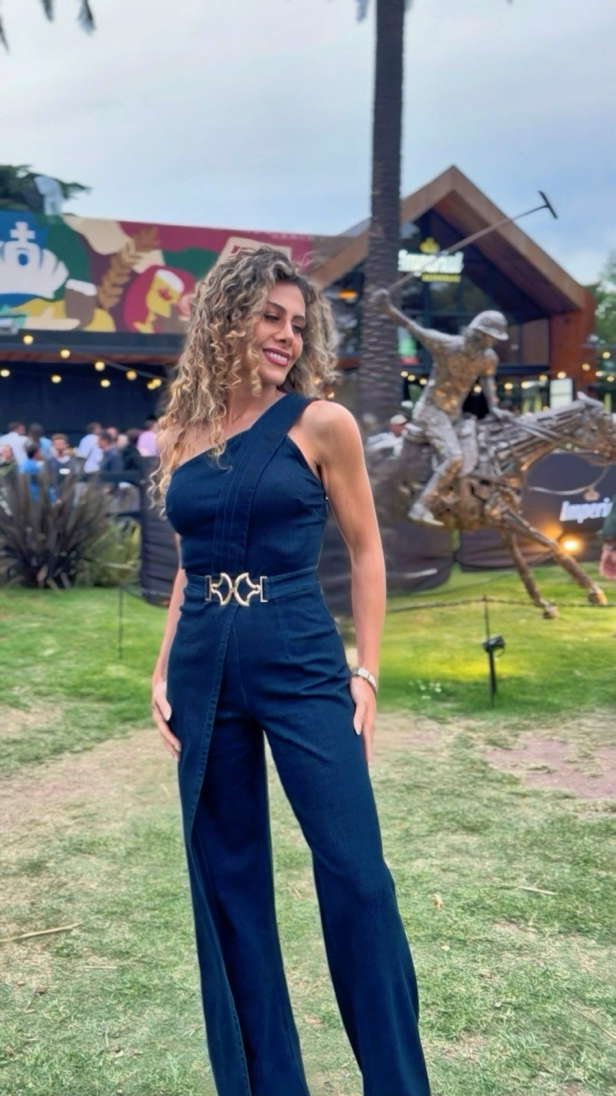 Este enterito largo de mezclilla elástica presenta un diseño asimétrico de un solo hombro que aporta un estilo moderno y sofisticado. Su cinturón con hebilla dorada permite ajustar la prenda al cuerpo, garantizando un calce perfecto y cómodo. Ideal para quienes buscan una combinación de elegancia y funcionalidad en una sola pieza.