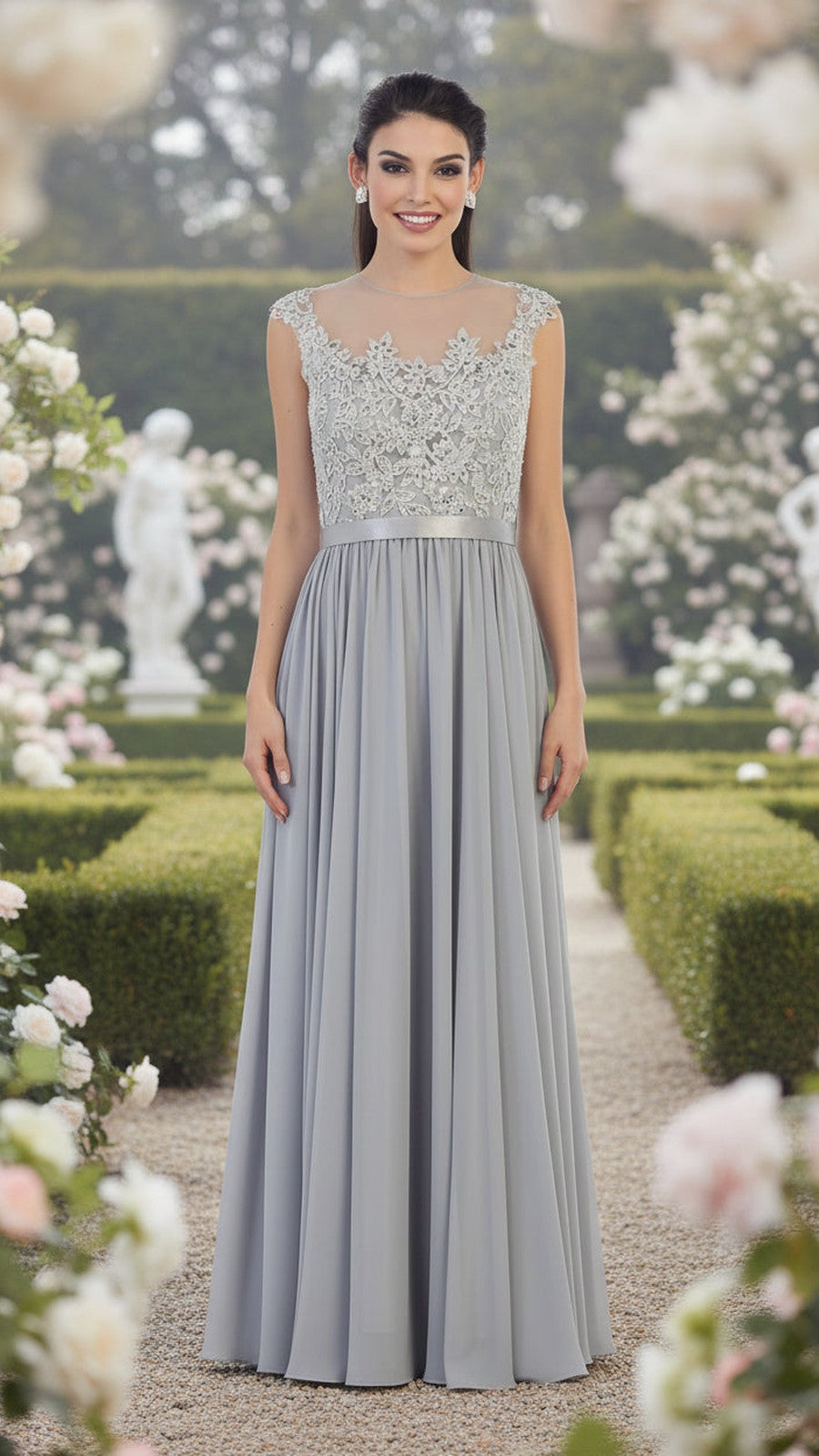 Diseñado para ocasiones especiales, este vestido largo combina sofisticación y discreción. Su escote presenta una delicada transparencia que mantiene la elegancia.